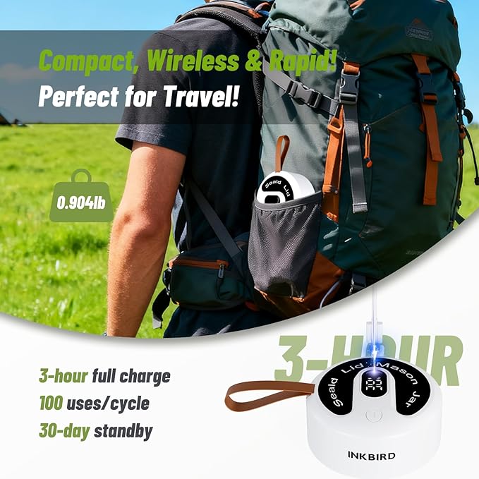 - 【One-Touch Automatic Operation】The INKBIRD Mason jar vacuum sealer kit has powerful suction of 60kPa, which removes air from jars/bags in seconds! Press 1 button to start—the vacuum seal for mason jars will automatically stop working after 60s (or pause anytime). Clear smart display shows battery level and vacuum time, giving you total control and confidence