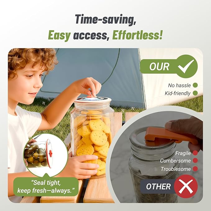 - 【Effortless to Open - No Tools Needed!】Tired of fumbling with jar openers? No more hunting for a jar opener! These reusable silicone lids have a built-in easy-open air valve—just a simple press to release air, and open with 1 hand (perfect for kids/seniors!), effortlessly.The superior silicone seal provides a tight seal for Mason jars or cans, keeping air out and food fresh for longer