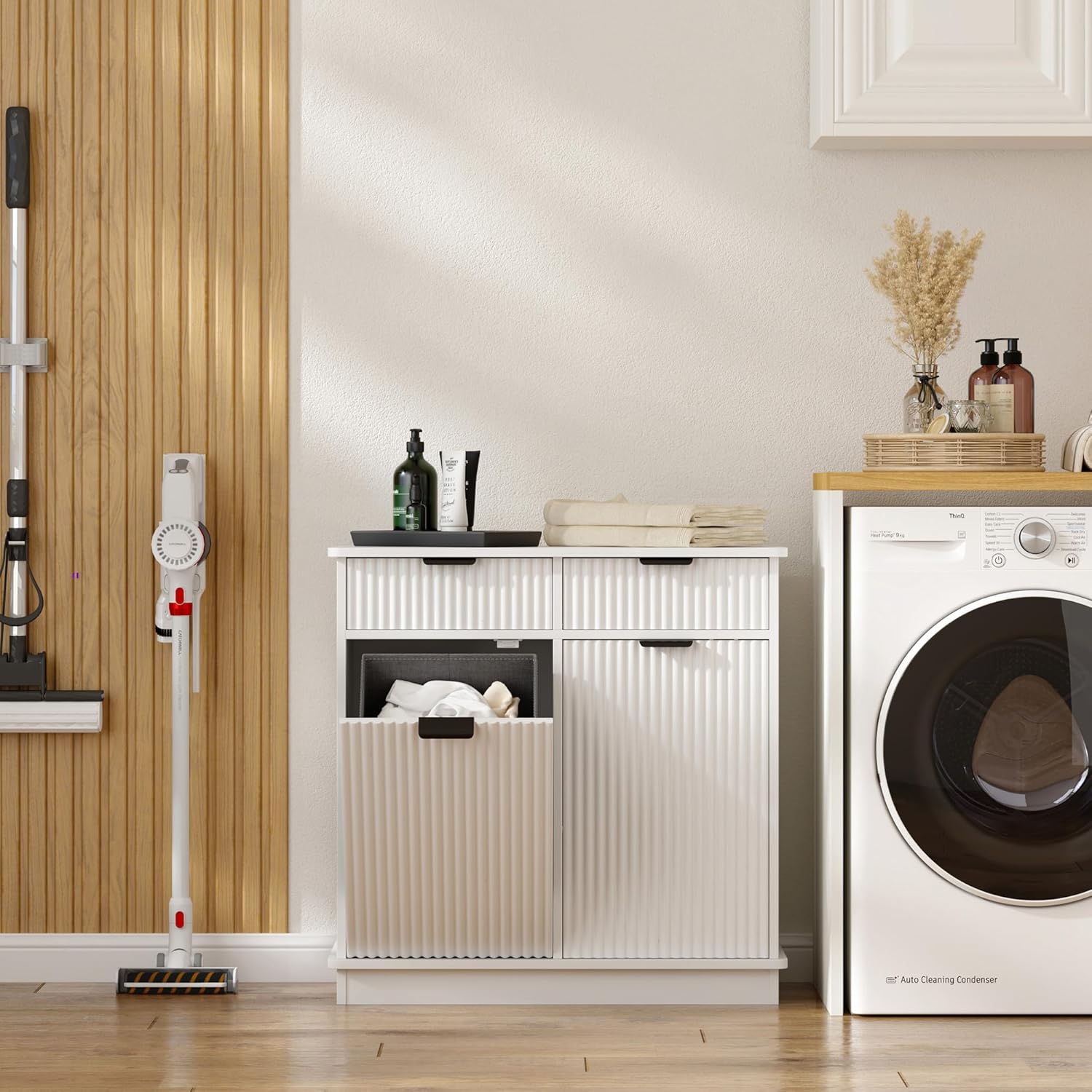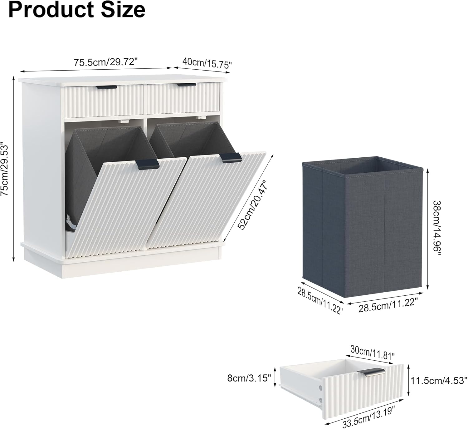 White Double Tilt Out Laundry Hamper Cabinet Laundry Basket Cabinet Hidden Laundry Hamper with 2 Drawers & 2 Baskets for Bathroom Bedroom,30x30x16in