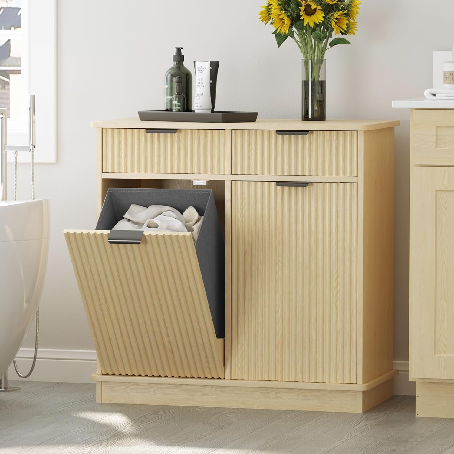 Natural Double Tilt Out Laundry Hamper Cabinet Laundry Basket Cabinet Hidden Laundry Hamper with 2 Drawers & 2 Baskets for Bathroom Bedroom,30x30x16in