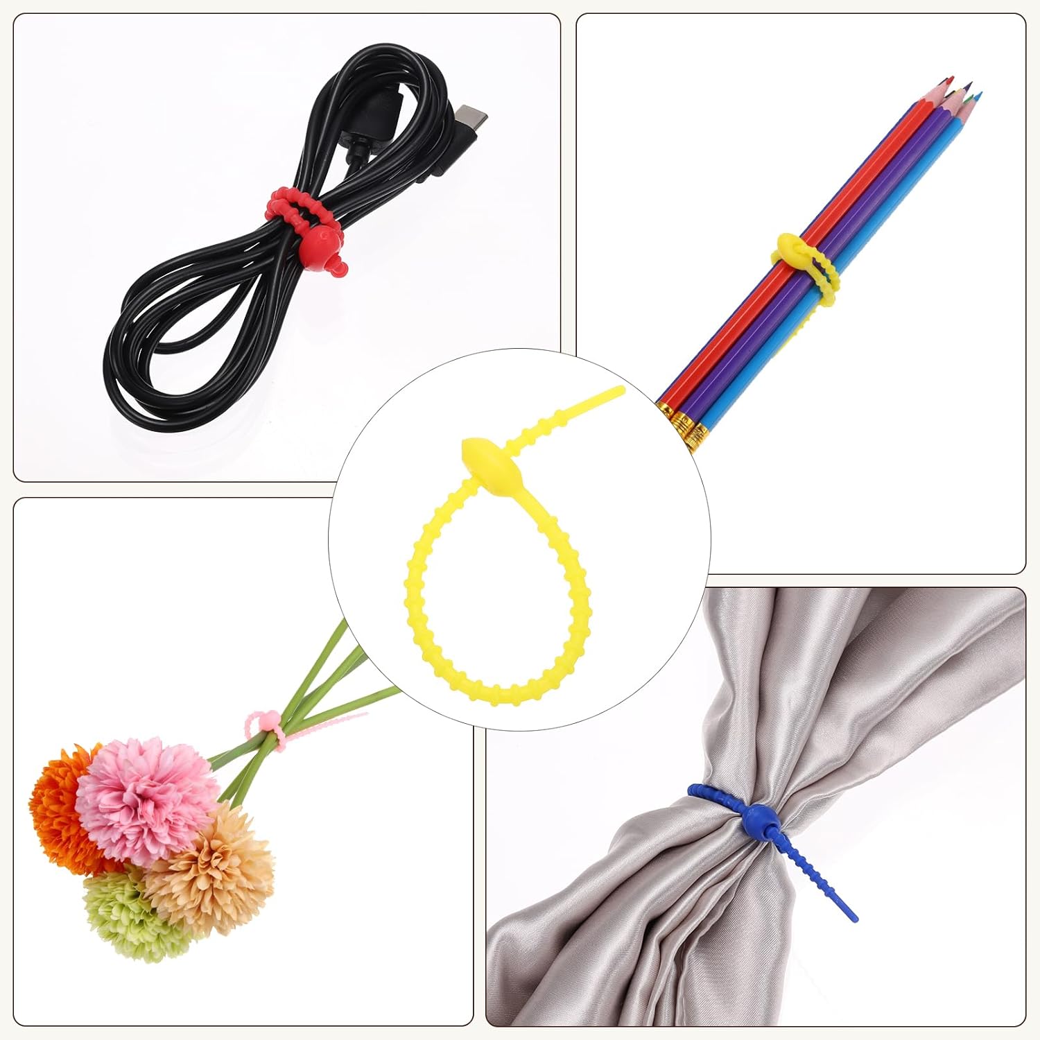 - Application: Silicone cable ties are suitable for sealing snack bags, organizing desks, drawers, tool boxes, trash bags, DIY keychain, bag charm, cord wrapping, kitchen storage, travel accessories, or any other indoor or outdoor use, which easily organize messy headphone cables, data cables, and other items.