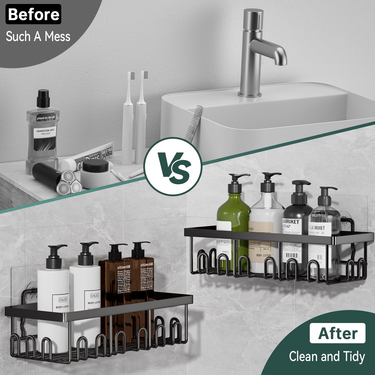 - 5 PCS Large storage shower caddy:The black bathroom organizer comes with 5 pieces for different uses,including 2 shower caddies,2 soap holders,1 toothbrush holde and 5 adhesives.It is suitable for bathrooms, kitchens,Rv,living rooms and bedrooms,the space can be fully utilized