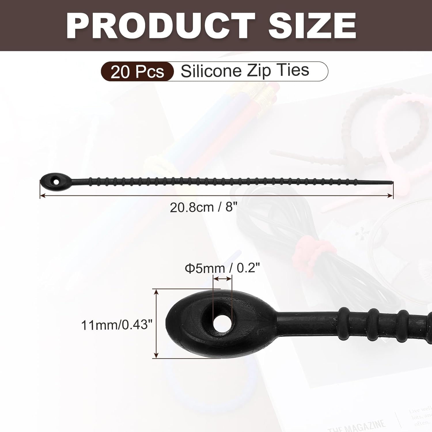 - Color: Black, Material: Silicone, Length: 20.8 cm / 8 inch, Width: 11 mm / 0.43 inch, Wire Diameter: 5 mm / 0.2 inch, Packing List: 20 Pcs x Silicone Zip Ties