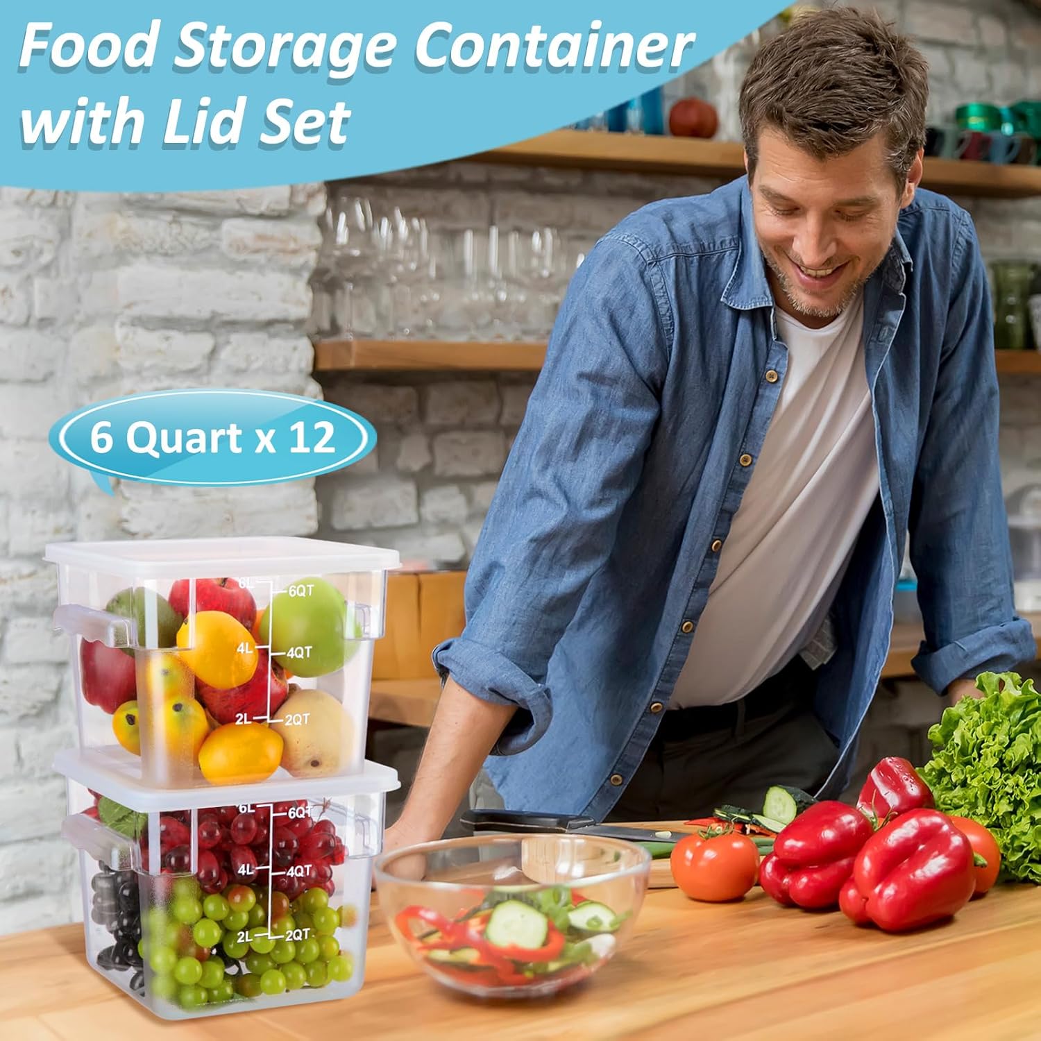Yungyan 12 Pcs 6 Qt Commercial Food Storage Containers with white Lids Restaurant Square Airtight Food Storage Containers Clear Cereal Container for Kitchen Freezer Dishwasher Pantry