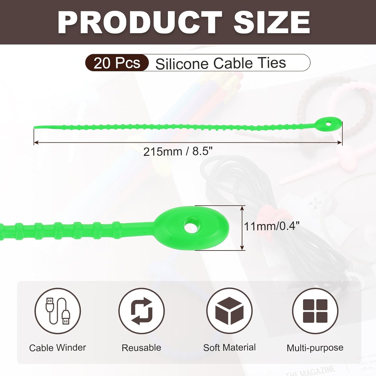 - Package & Size: You will receive 20 pieces of silicone cable ties, each of them are in the size of 8.5 x 0.4 inch/215 x 11 mm(LxW). You can use these ties to organize charging cables. Note: Actual size may vary due to manual measurement.