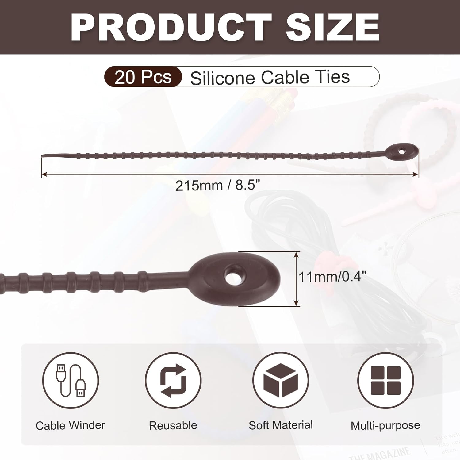 - Package & Size: You will receive 20 pieces of silicone cable ties, each of them are in the size of 8.5 x 0.4 inch/215 x 11 mm(LxW). You can use these ties to organize charging cables. Note: Actual size may vary due to manual measurement.