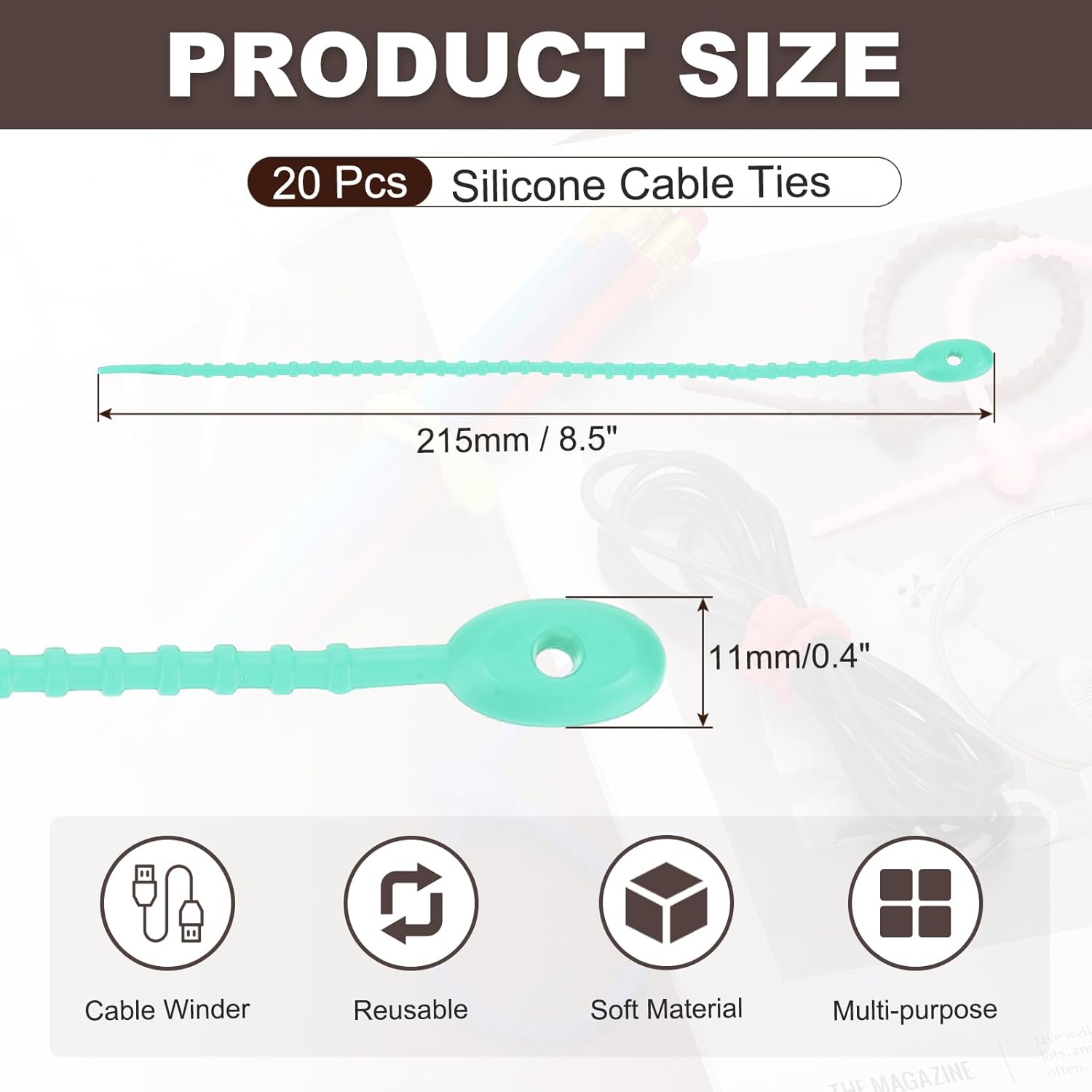 - Package & Size: You will receive 20 pieces of silicone cable ties, each of them are in the size of 8.5 x 0.4 inch/215 x 11 mm(LxW). You can use these ties to organize charging cables. Note: Actual size may vary due to manual measurement.
