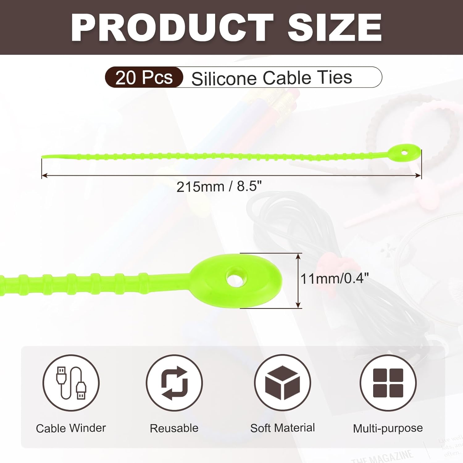 - Package & Size: You will receive 20 pieces of silicone cable ties, each of them are in the size of 8.5 x 0.4 inch/215 x 11 mm(LxW). You can use these ties to organize charging cables. Note: Actual size may vary due to manual measurement.