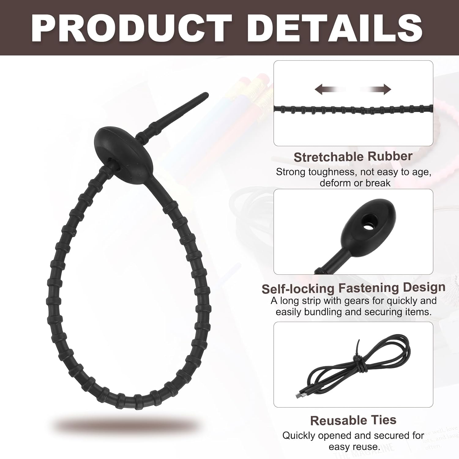 - Durable Material: Made of stretchable rubber with good insulation, toughness and abrasion resistance, these cable ties are not prone to aging, deformation and breakage, and can be used stably for a long time.