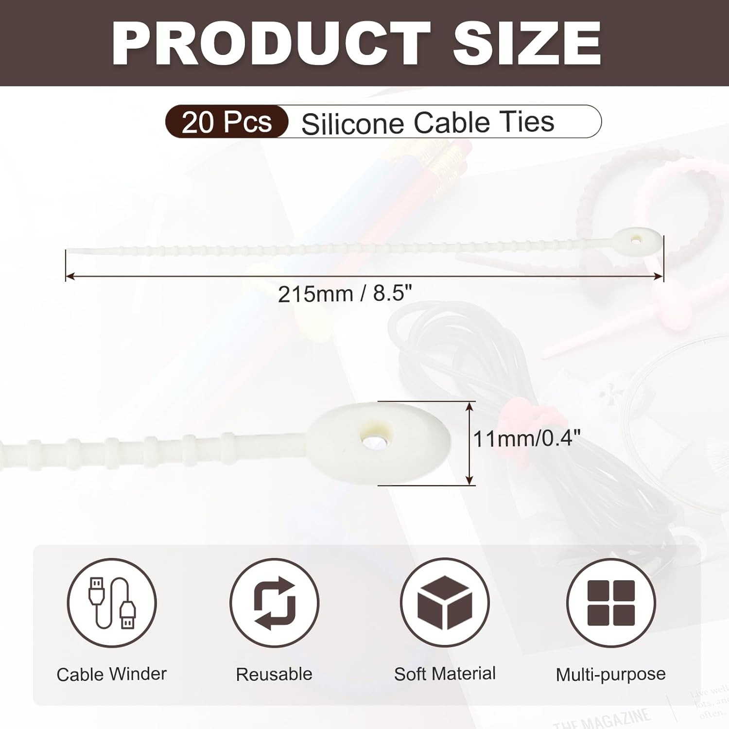 - Package & Size: You will receive 20 pieces of silicone cable ties, each of them are in the size of 8.5 x 0.4 inch/215 x 11 mm(LxW). You can use these ties to organize charging cables. Note: Actual size may vary due to manual measurement.