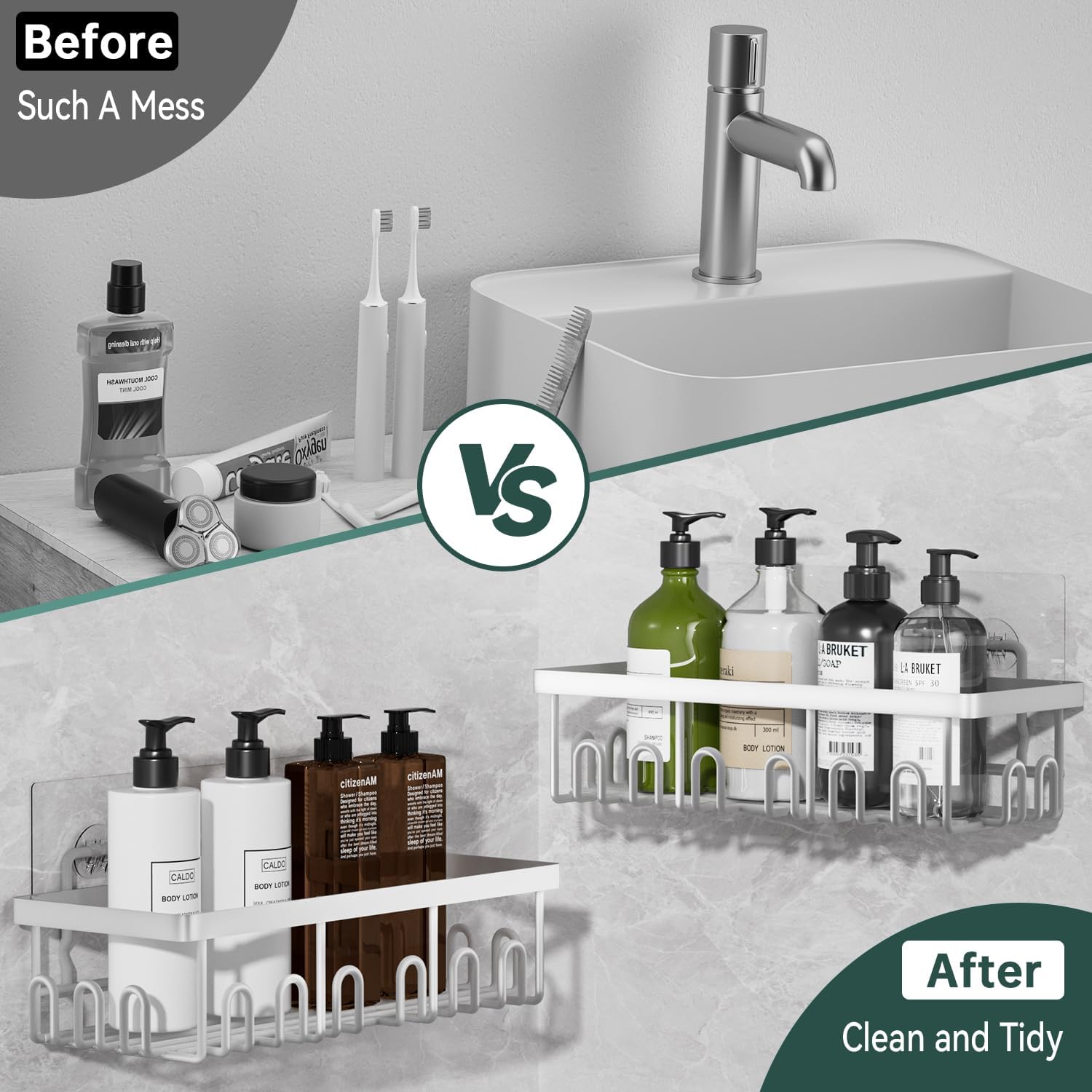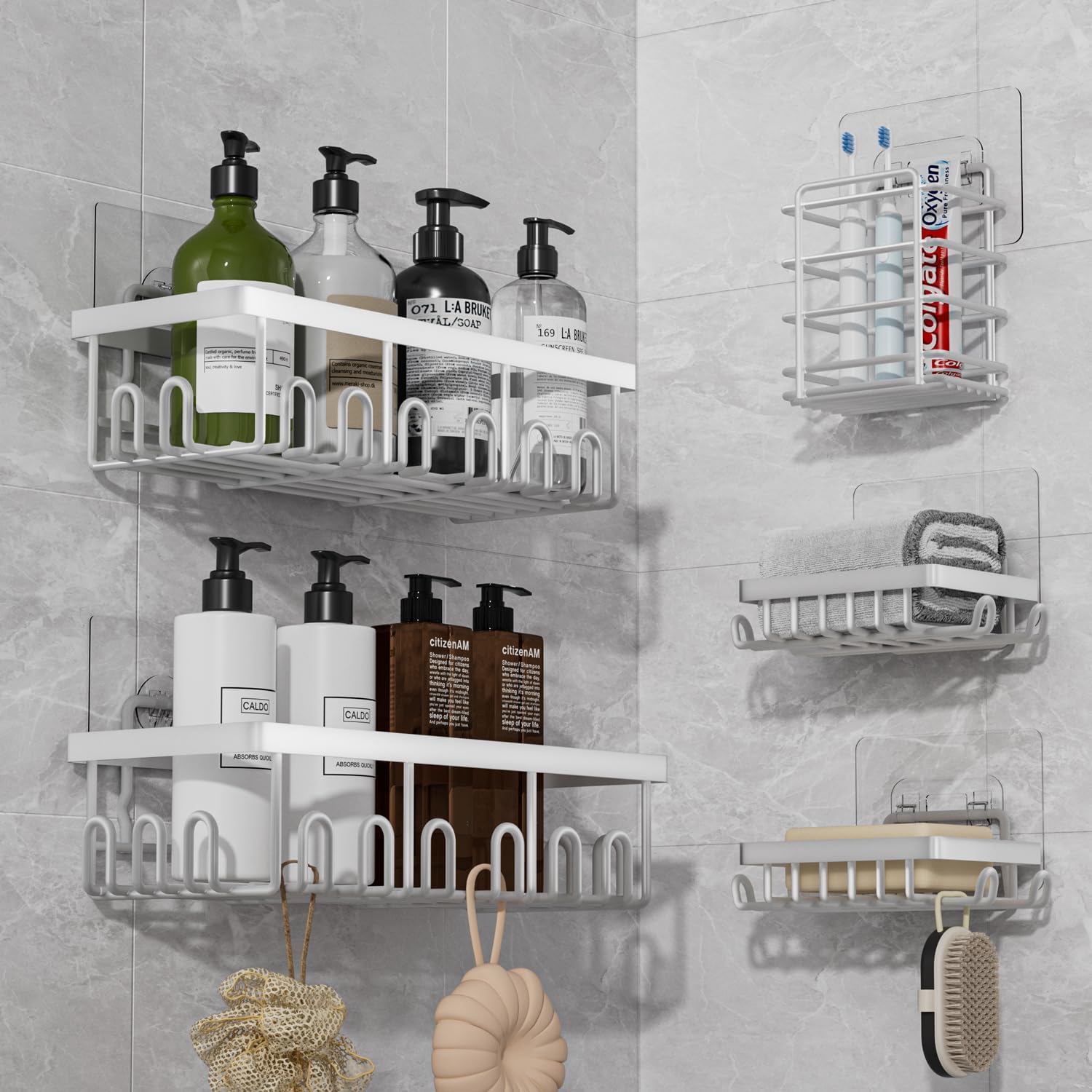 - 5 PCS Large Storage Shower Caddy This white bathroom organizer set includes 5 versatile pieces—2 shower caddies, 2 soap holders, 1 toothbrush holder, and 5 strong adhesives. With its large-capacity design, you can easily store toiletries, skincare products, or even kitchen condiments, making full use of your space and keeping daily essentials within reach. Suitable for bathrooms, kitchens, RVs, living rooms, and bedrooms