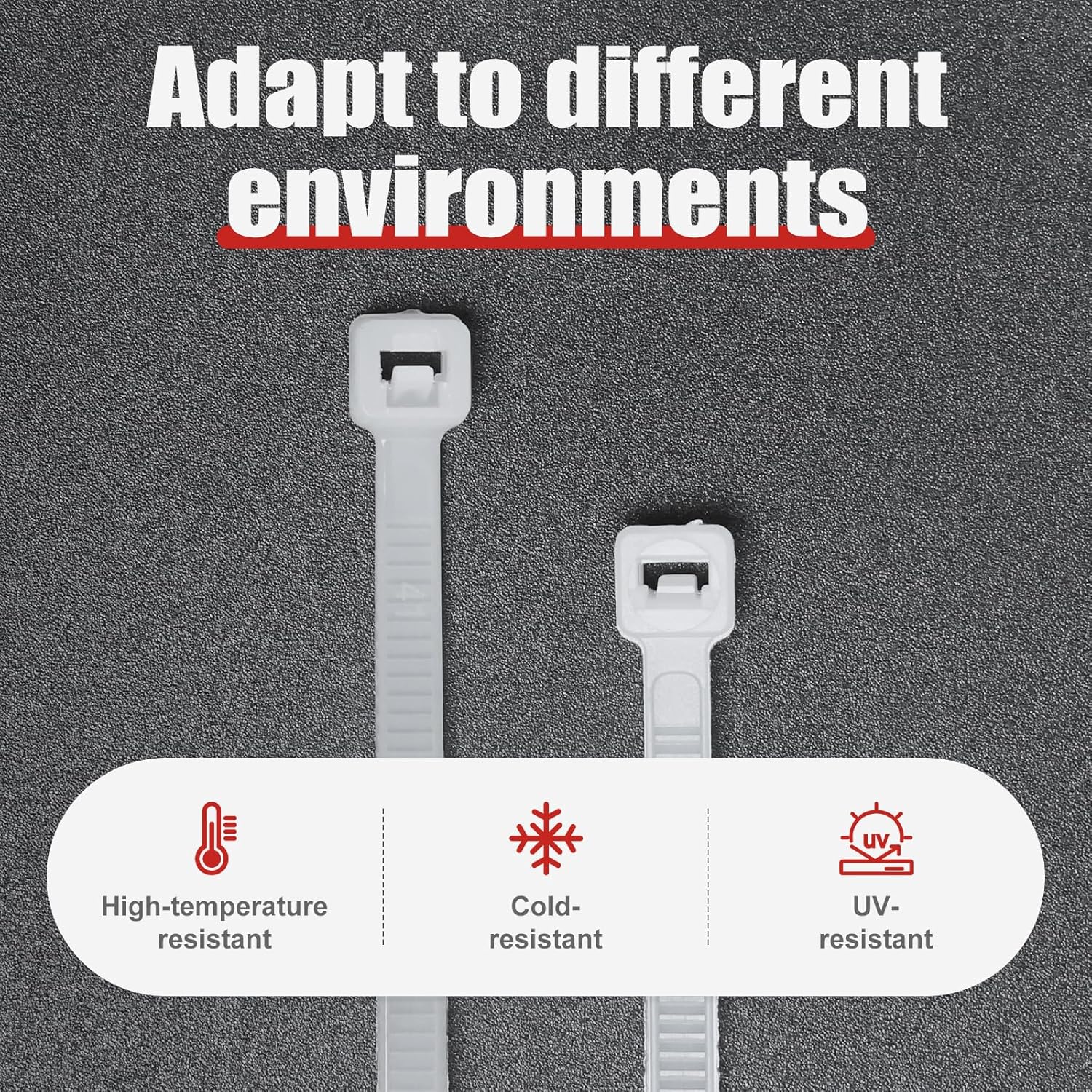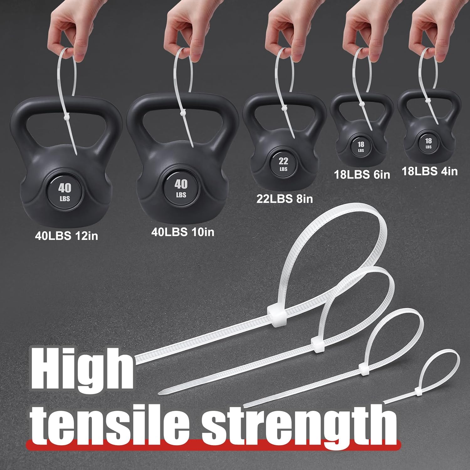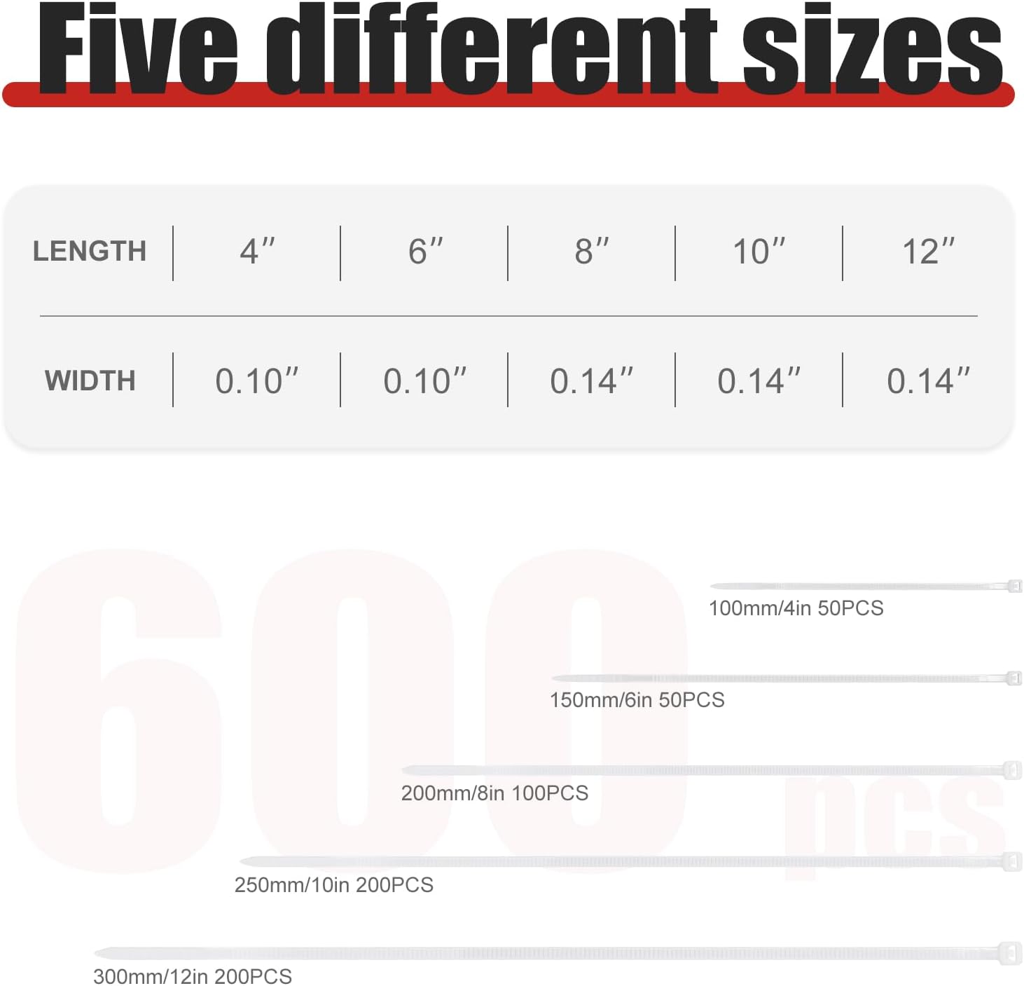 - Product Configuration: Total 600 cable ties, 4-inch × 200 pieces, 6-inch × 200 pieces, 8-inch × 100 pieces, 10-inch × 50 pieces,12-inch × 50 pieces.