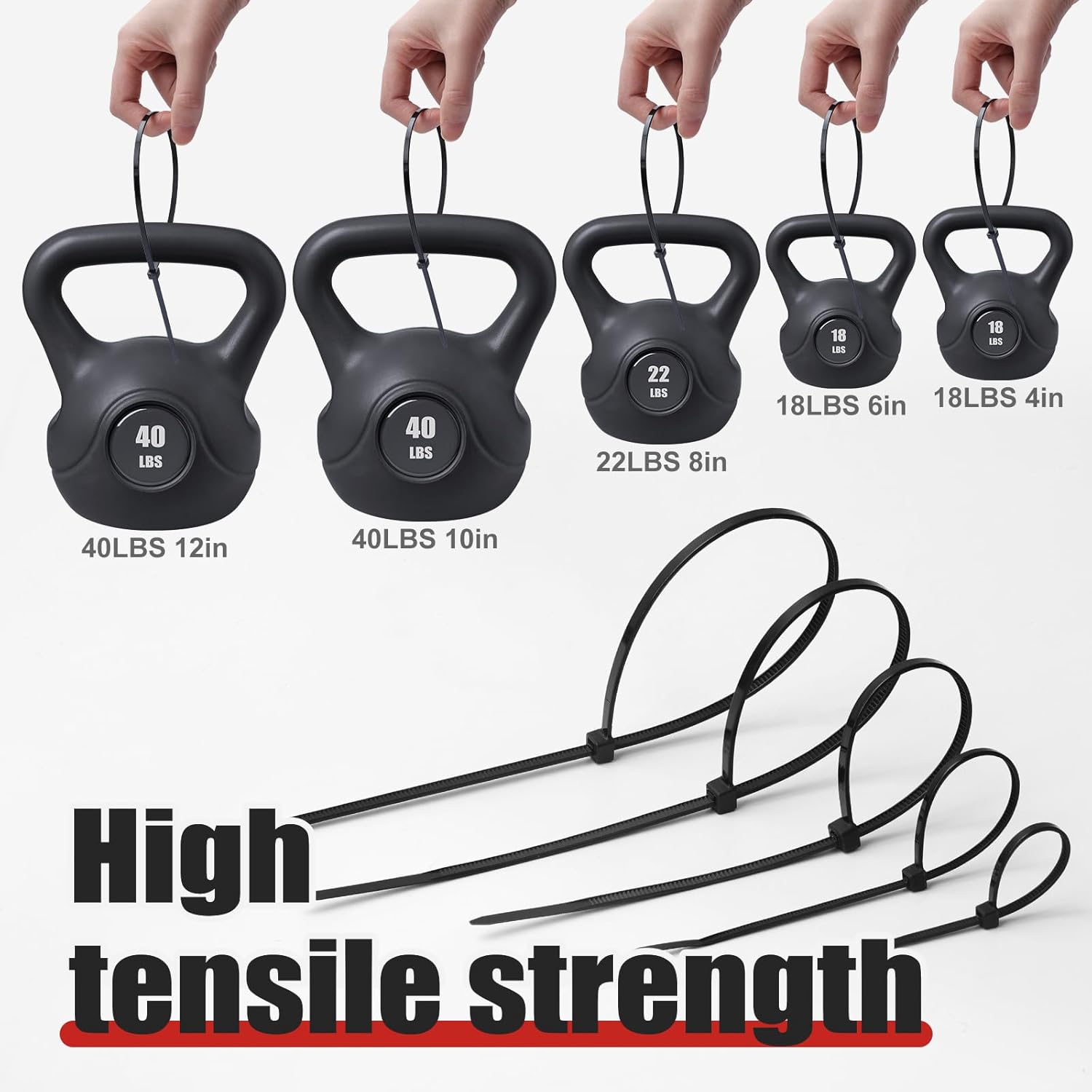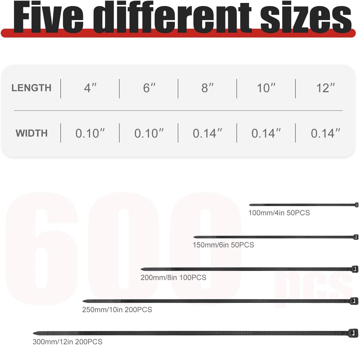 - Product Configuration: Total 600 cable ties, 4-inch × 200 pieces, 6-inch × 200 pieces, 8-inch × 100 pieces, 10-inch × 50 pieces,12-inch × 50 pieces.