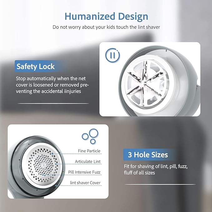 - Safe Protection : This fuzz remover fabric shaver is equipped with an upgraded version detachable stainless steel large mesh cover with a diameter of 70mm. The slight arc can fit the clothes and keep a safe distance from the cutter head, thus protecting the fabric surface from damage. If the mesh cover of the electric lint remover shaver becomes loose or falls off, it will stop working immediately to prevent fabric damage.