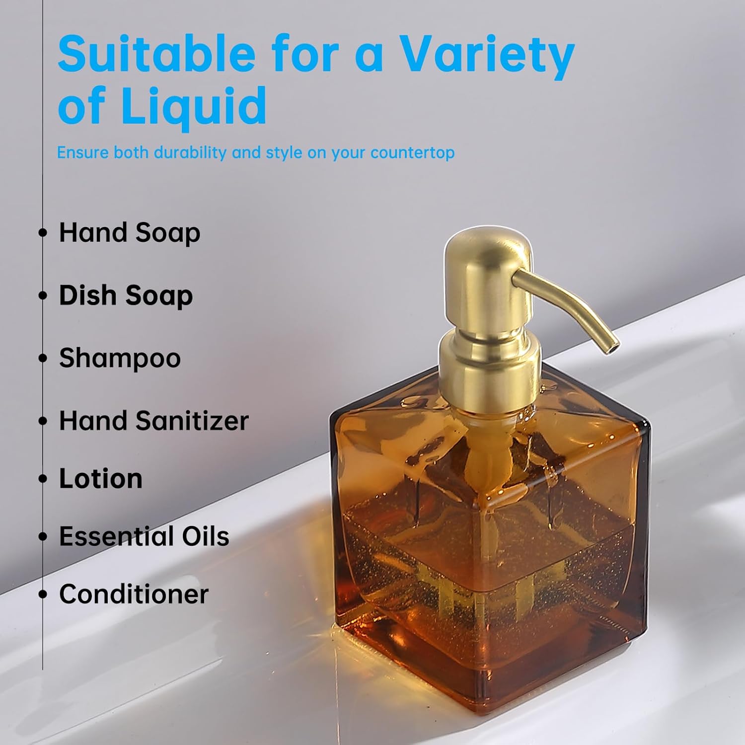 Square Bathroom Soap Dispenser Amber Bottle with Brushed Gold Pump, Retangle Cube 8.4 oz Glass Bottles with Stainless Steel Pump Hand Liquid Soap Dispenser Kitchen