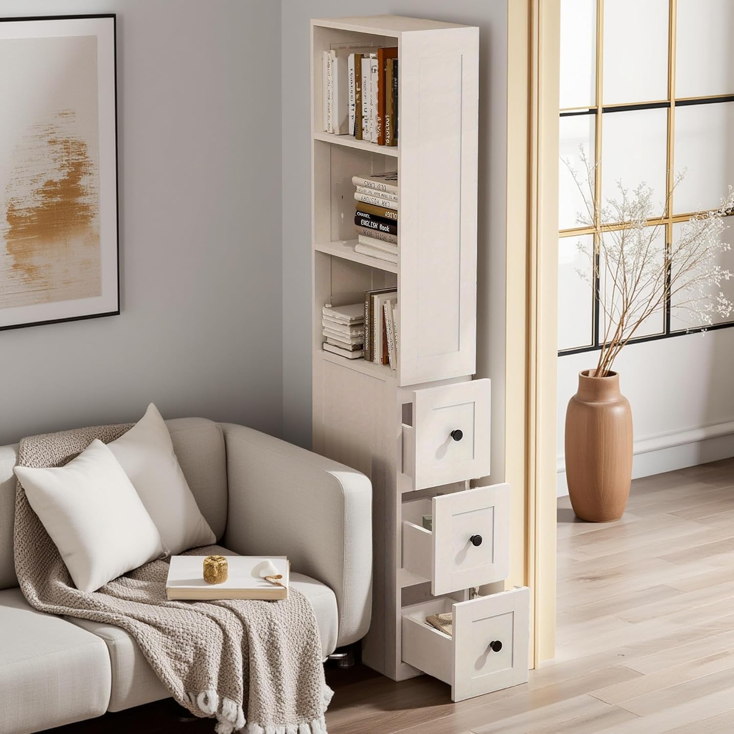 - 【Adjustable Shelves】Our slim bathroom storage cabinet boasts 3 slide-out drawers and 2 adjustable shelves. Each shelf provides 1.18" of adjustable space on both the top and bottom. A locking feature is incorporated where the shelves are fastened, ensuring they remain secure and won't fall off when locked.