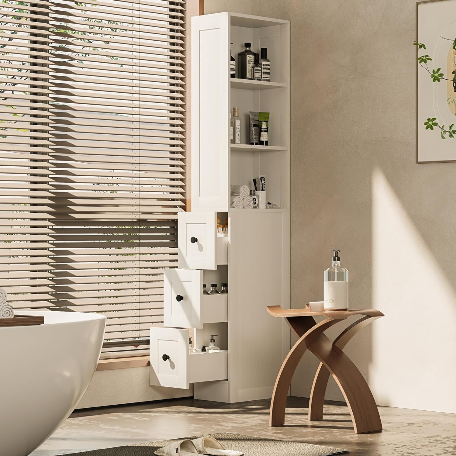 LAUSAINT HOME Tall Bathroom Storage Cabinet, Anti-Tipping Narrow Floor Cabinet with 2 Adjustable Shelves & 3-Level Drawers for Small Space, Home, Bathroom, Kitchen, Laundry (White)