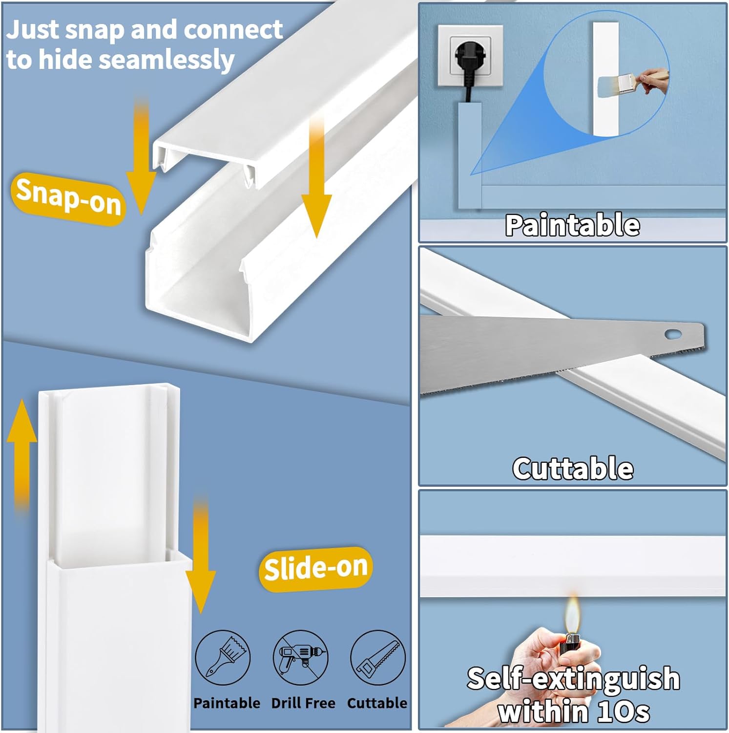 - Cuttable and Paintable Cord Concealer: Wire channels made of high-quality PVC material; If you think the wire cover is too long, you can easily use a knife or hacksaw to cut it to whatever length desired and paint the cable cover to whatever color you need to match your wall