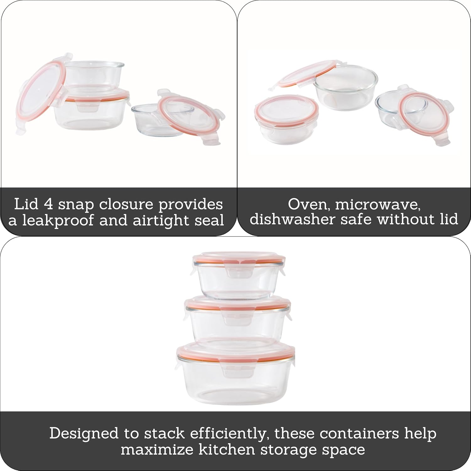 - SECURE AND LEAKPROOF: Each container includes a lid with four snap closures providing an airtight and leakproof seal, preventing spills and locking in flavor, stackable design maximizes storage space and keeps your kitchen organized