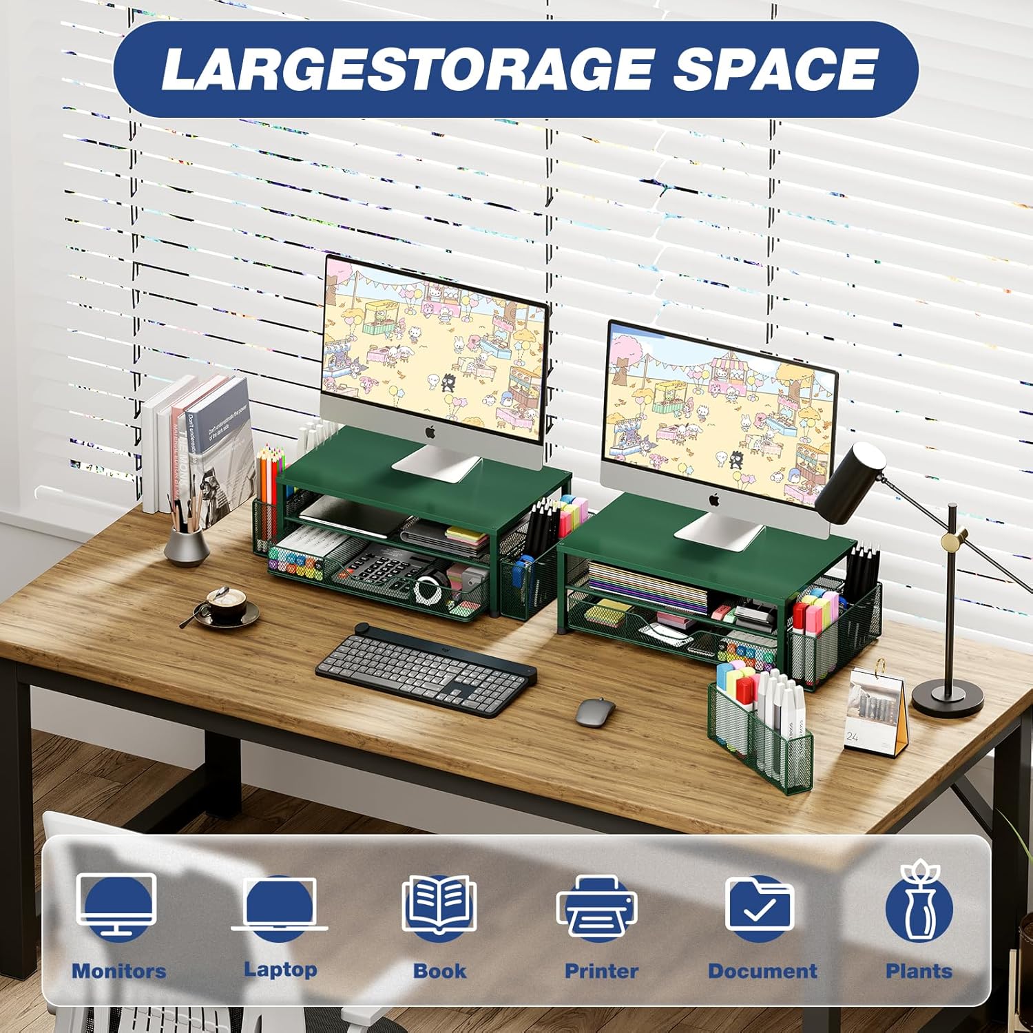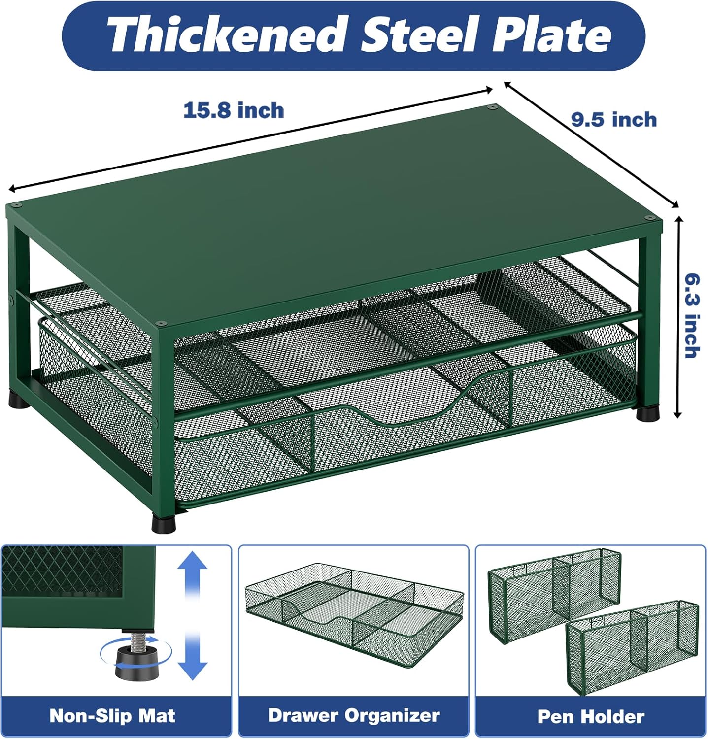 Desk Organizers and Accessories, 2-Tier Computer Monitor Stand Riser with Drawer and 2 Pen Holders, Laptop Stand, Office Desk Accessories for Office Supplies, Dark Green