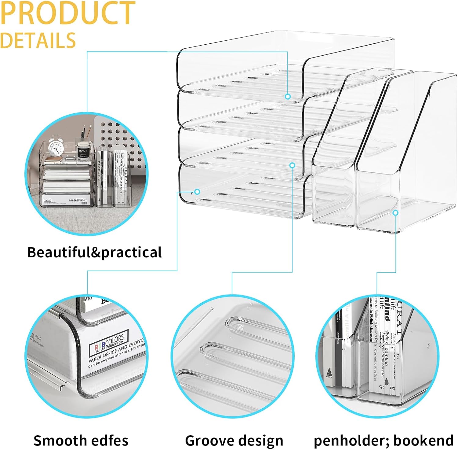 4-Tier Brown Acrylic Paper Tray Organizer for Desk + 2 Bookends – Stackable Letter Tray, Acrylic Desk Accessories/File Organizer, Office Paper Organizer