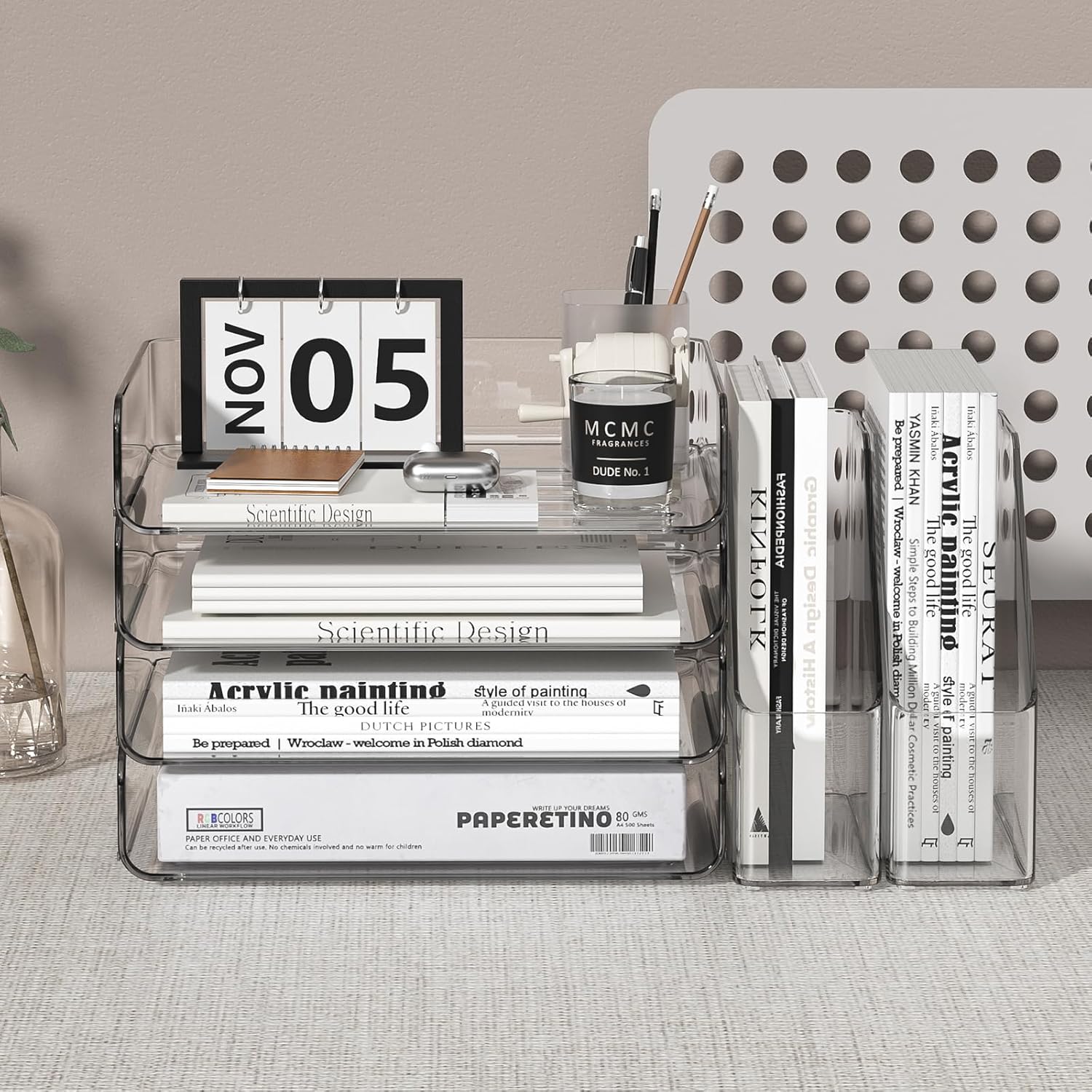 4-Tier Clear Acrylic Paper Tray Organizer for Desk with 2 Matching Bookends – Stackable Letter Tray Set, Stackable Paper Trays, Acrylic Desk Accessories/File Organizer, Office Organizer