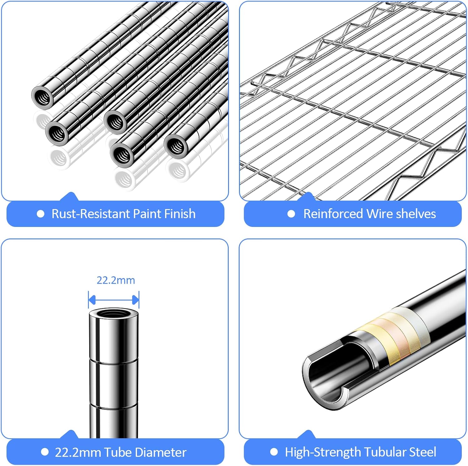 - 【Adjustable Shelves – Flexible for All Needs】Customize your storage your way. Each shelf can be easily adjusted in 1-inch increments to fit items of varying sizes—from bulky tools to compact kitchenware. This wire shelving unit adapts to your unique storage needs, creating a more organized and efficient space.