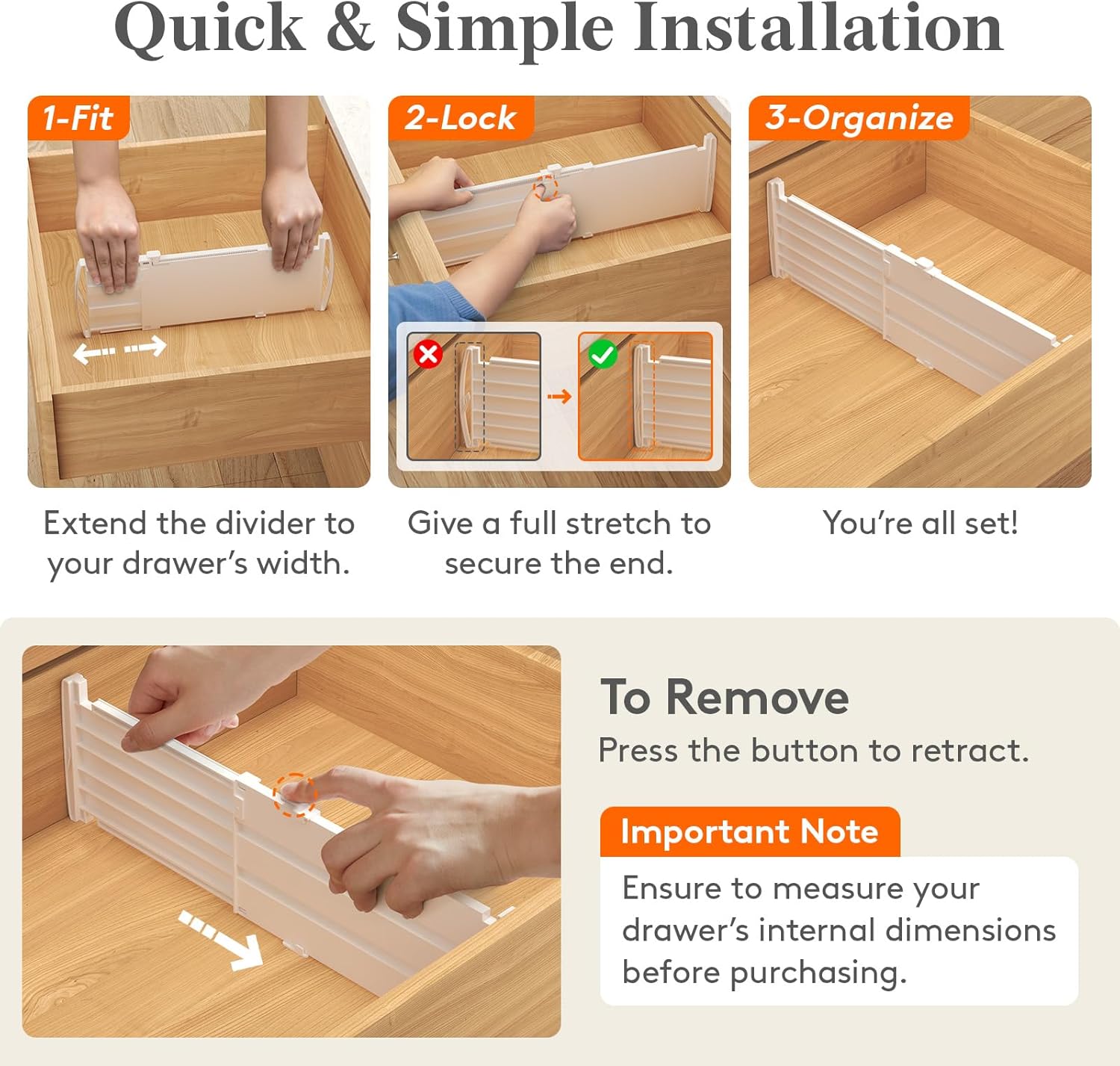 - Built to Last: Made from robust, shatterproof, and abrasion-resistant ABS plastic, these adjustable drawer dividers offer a sturdy yet comfortable experience. Silicone strips on both sides provide gentle cushioning, effectively protecting your drawers from scratches and damage without leaving marks or odors
