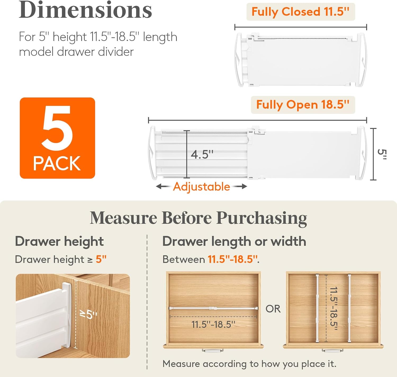 - Customizable Fit for Drawer: Standing 5" (12.8 cm) tall and adjusting from 11.5" to 18.5" (29.5 - 47 cm), these dresser organizers effortlessly fit most drawers, ensuring your items are always perfectly organized and your space stays tidy