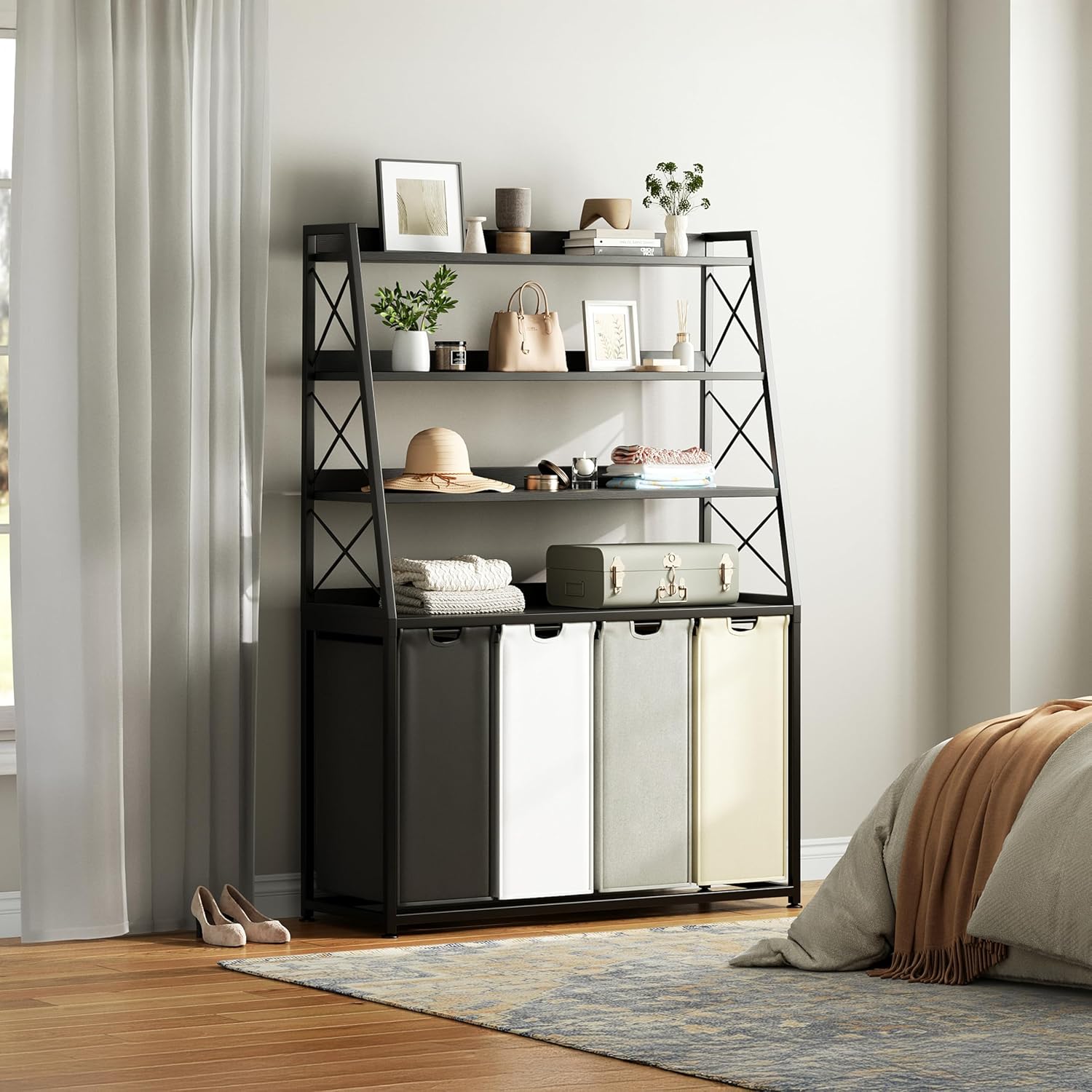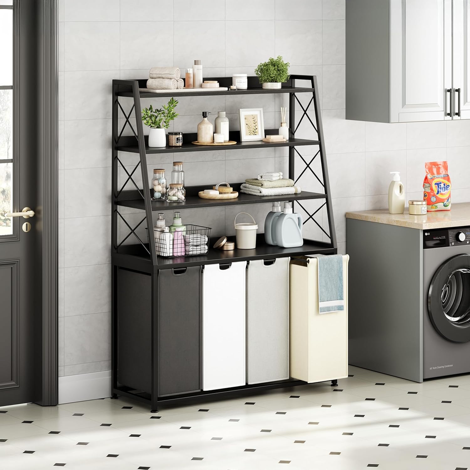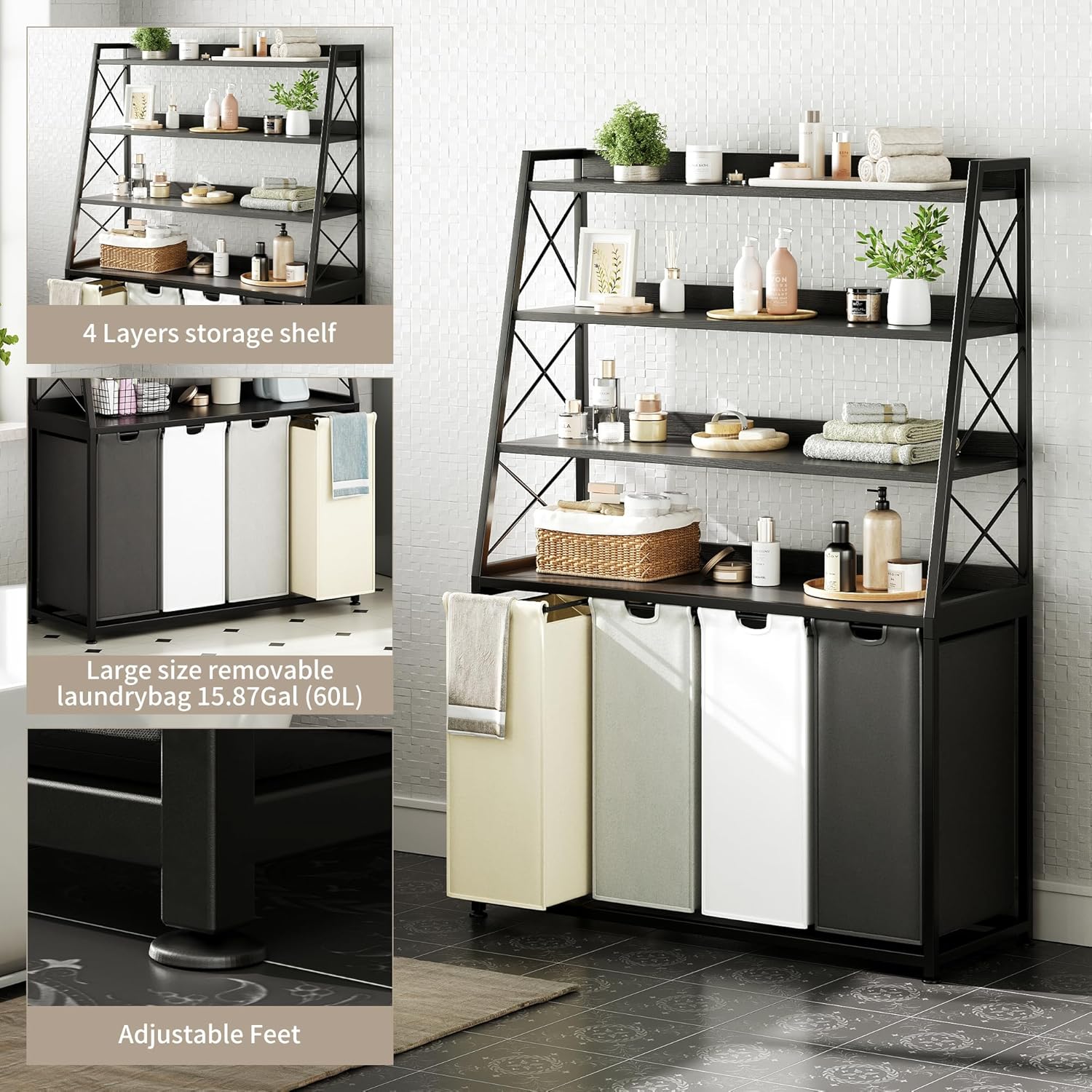 - Versatile and stylish design - The laundry Hamper with shelves features a detachable and pull-out design, and the four laundry bags can be removed from the shelves. It combines functionality with style, complementing the decor of any room, whether it's placed in the laundry room, bathroom, or bedroom. The vertical sorter design saves valuable floor space, allowing you to optimize your room layout