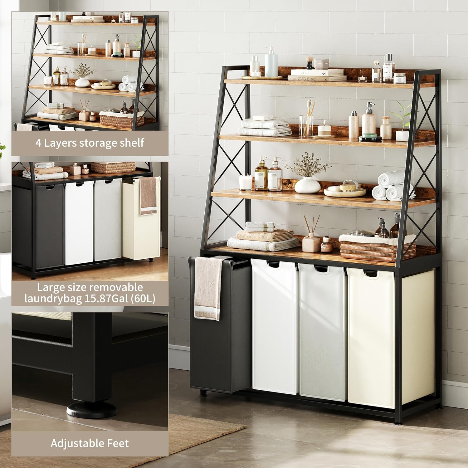 Laundry Basket, 4 Section Laundry Hamper with 4 Tiers Shelf, Pull-Out and Removable Laundry Bags, Large 4 x 15.87 Gallons, for Laundry Room Bathroom Rustic Brown PF12XLN