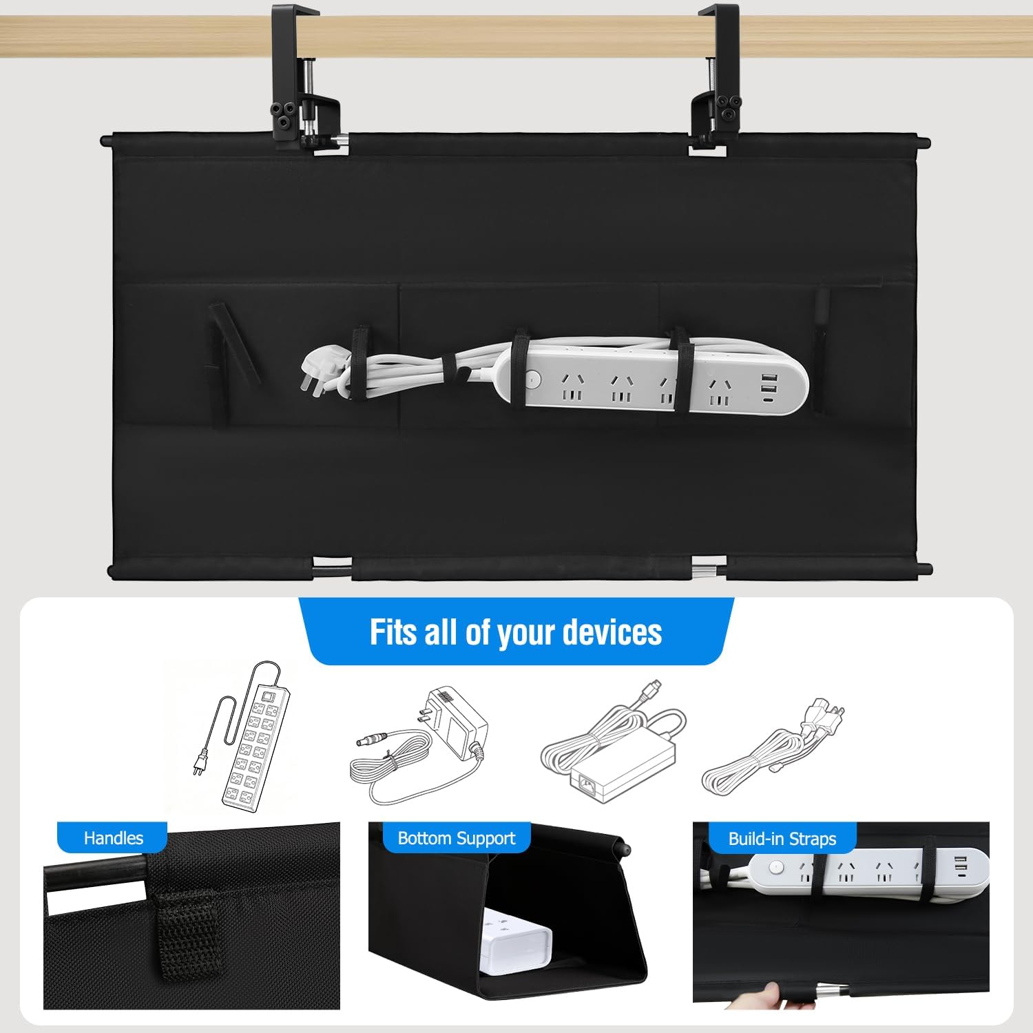 Under Desk Cable Management Tray - Heavy Duty No-Drill Clamp & Screw Mount, 28-Inch Cord Organizer for Home Office, Gaming Setup & Study Room, Holds Power Strip & Large Adapters (Black, 28"L x 5.5"W)