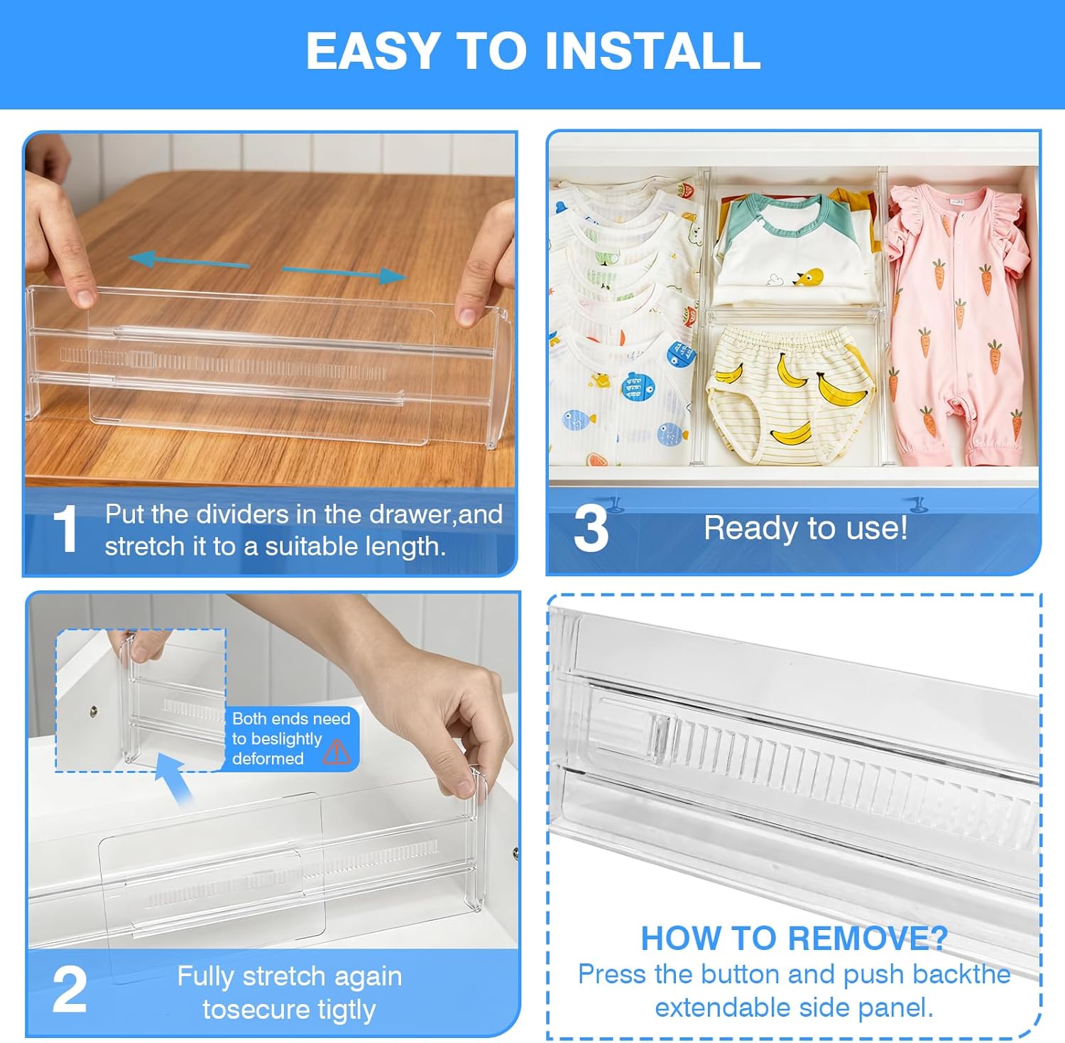 - Easy Installation & Removal:Adjust the divider to a suitable length before install, through strong spring tension and silicone friction makes drawer divider more stable. When not in use, just press the button and push back the extendable side panel. (Note: Clean the drawer before use)