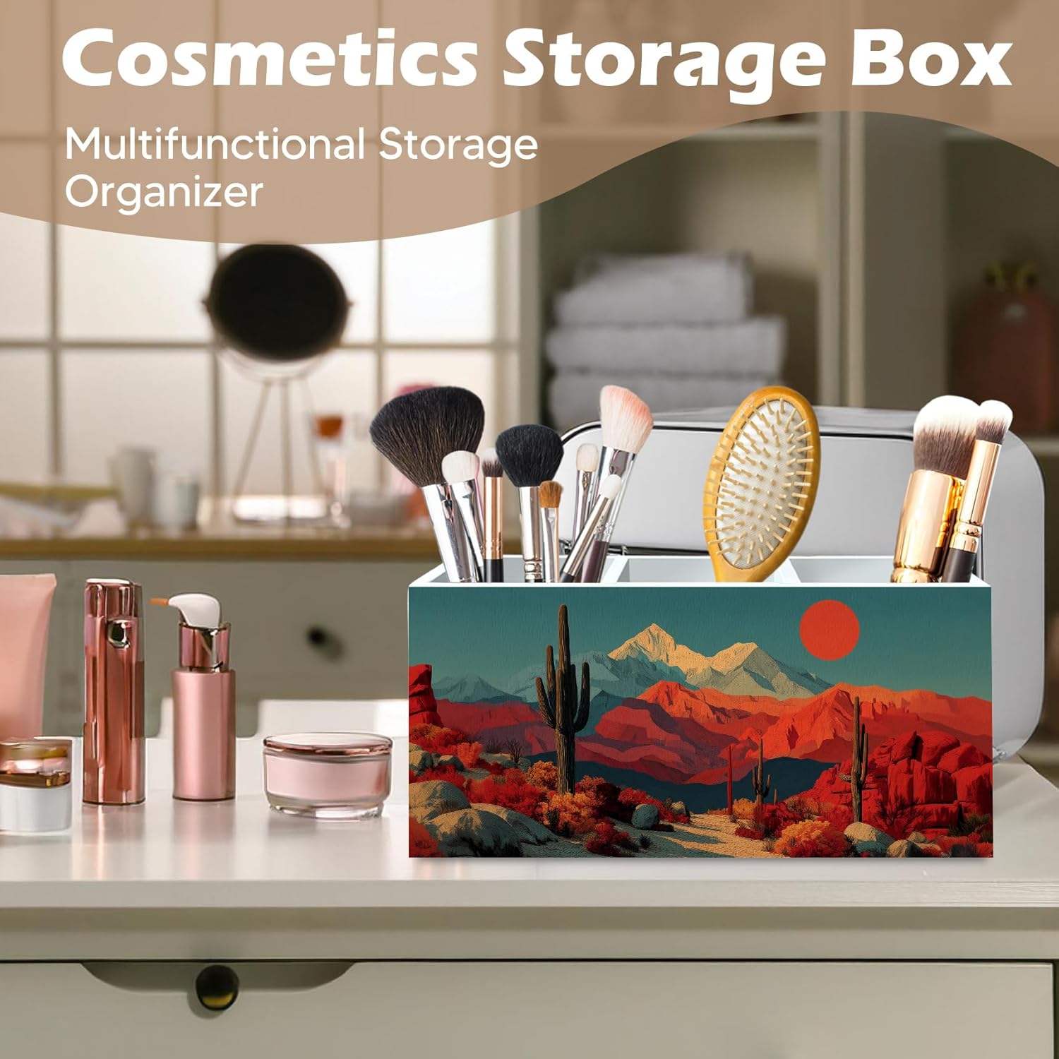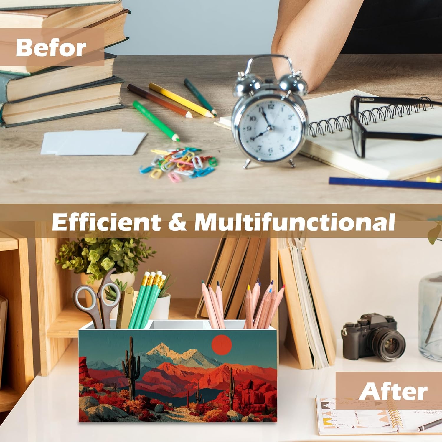DILSJ Western Boho Pen Pencil Holder Organizer for Desk, Boho Office Decor, Western Mountain Desert Cactus Landscape Wooden Box Signs for Home Office Desk Tabletop Decoration