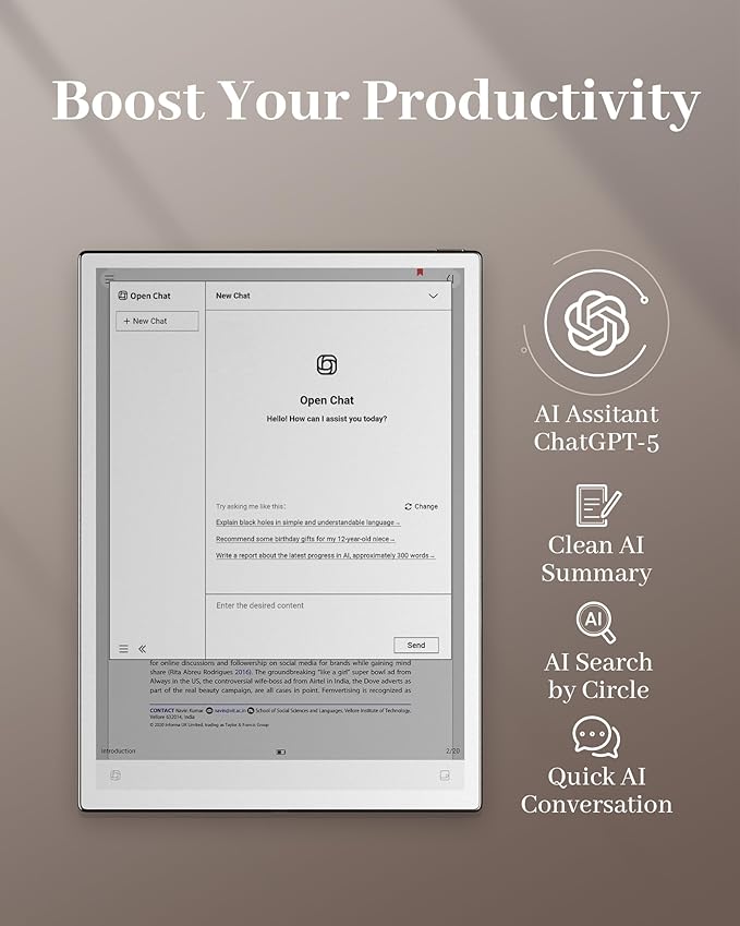 - Built-In AI Assistance – As a smart digital notebook, the iFLYTEK AINOTE 2 lets you circle any text for real-time solutions from ChatGPT-5. This seamless AI integration makes it a powerful supernote alternative and the ultimate electronic notebook with pen for efficient learning and working.