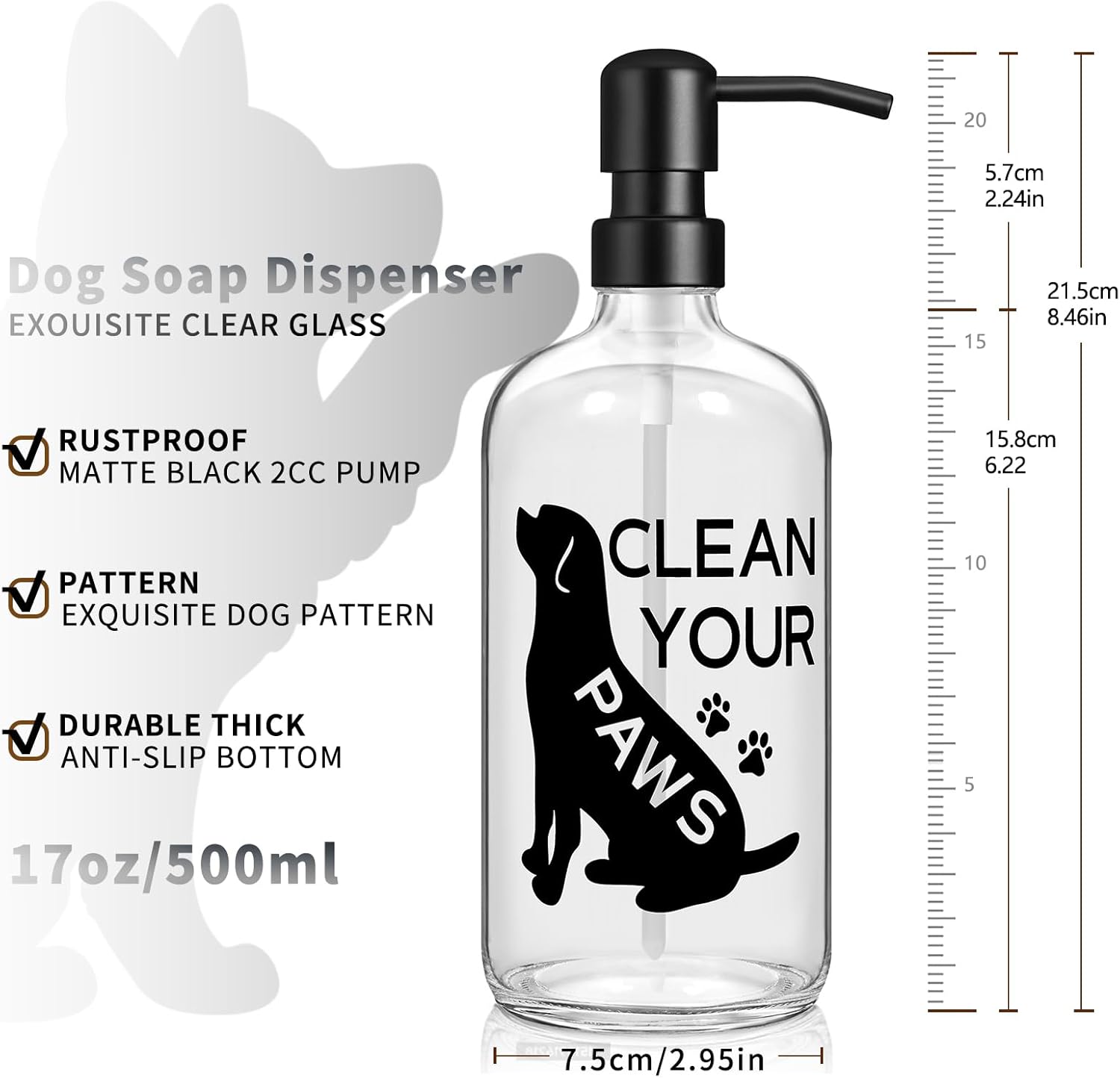 - Pet Inspired Design:Clear glass dispenser with cute dog and paw print design a fun reminder to Clean Your Paws for pet friendly homes