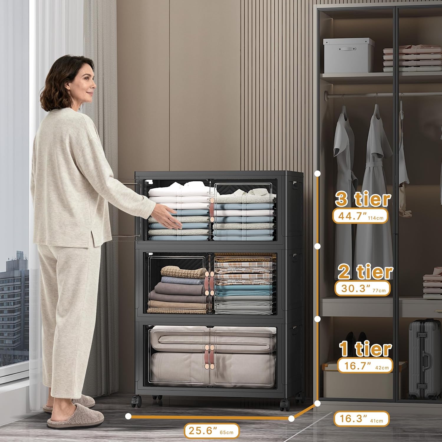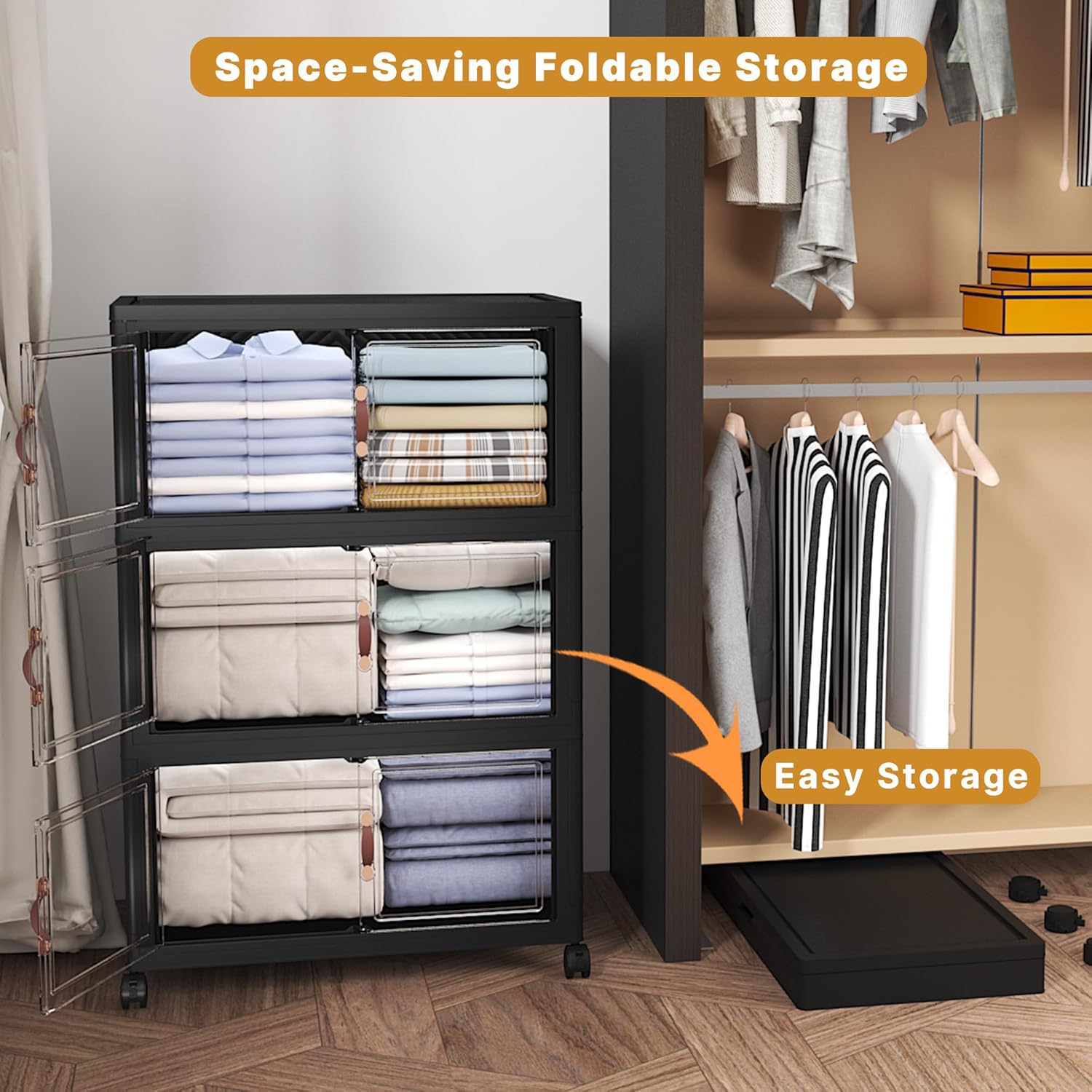 Extra Large Stackable Storage Bins with Lids & Wheels & Door, 672QT-112QT/28GAL*6Pack Foldable Collapsible Closet Organizers, Plastic containers drawers for bedroom Dorm