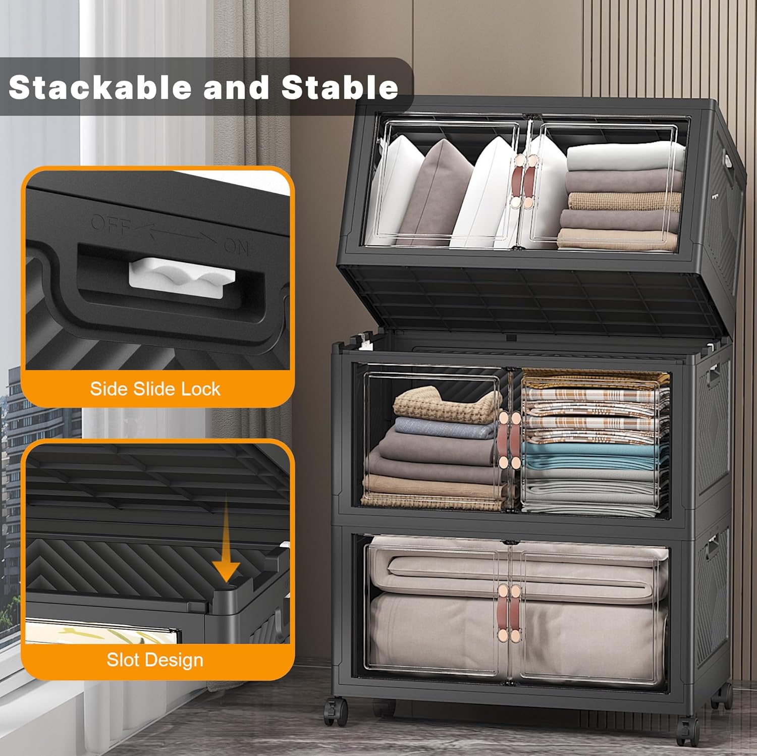 - 【Smooth Mobility with Locking Wheels】: Easily move your storage wherever you need it. These stackable storage bins with wheels feature four smooth-rolling casters, including two locking brakes, keeping your bins stable yet mobile — great for bedrooms, dorms, or offices.