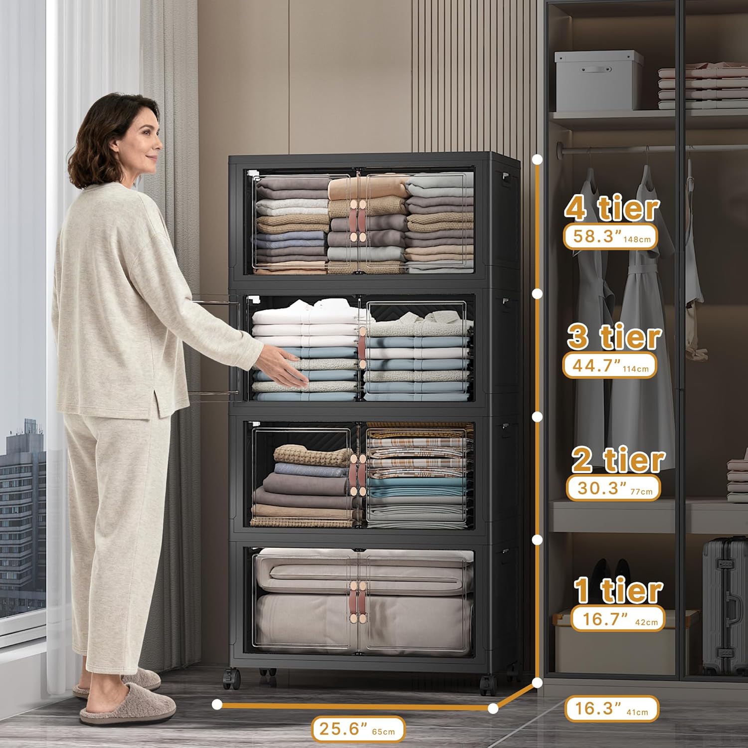 Extra Large Stackable Storage Bins with Lids & Wheels & Door, 896QT-112QT/28GAL*8Pack Foldable Collapsible Closet Organizers, Plastic containers drawers for bedroom Dorm