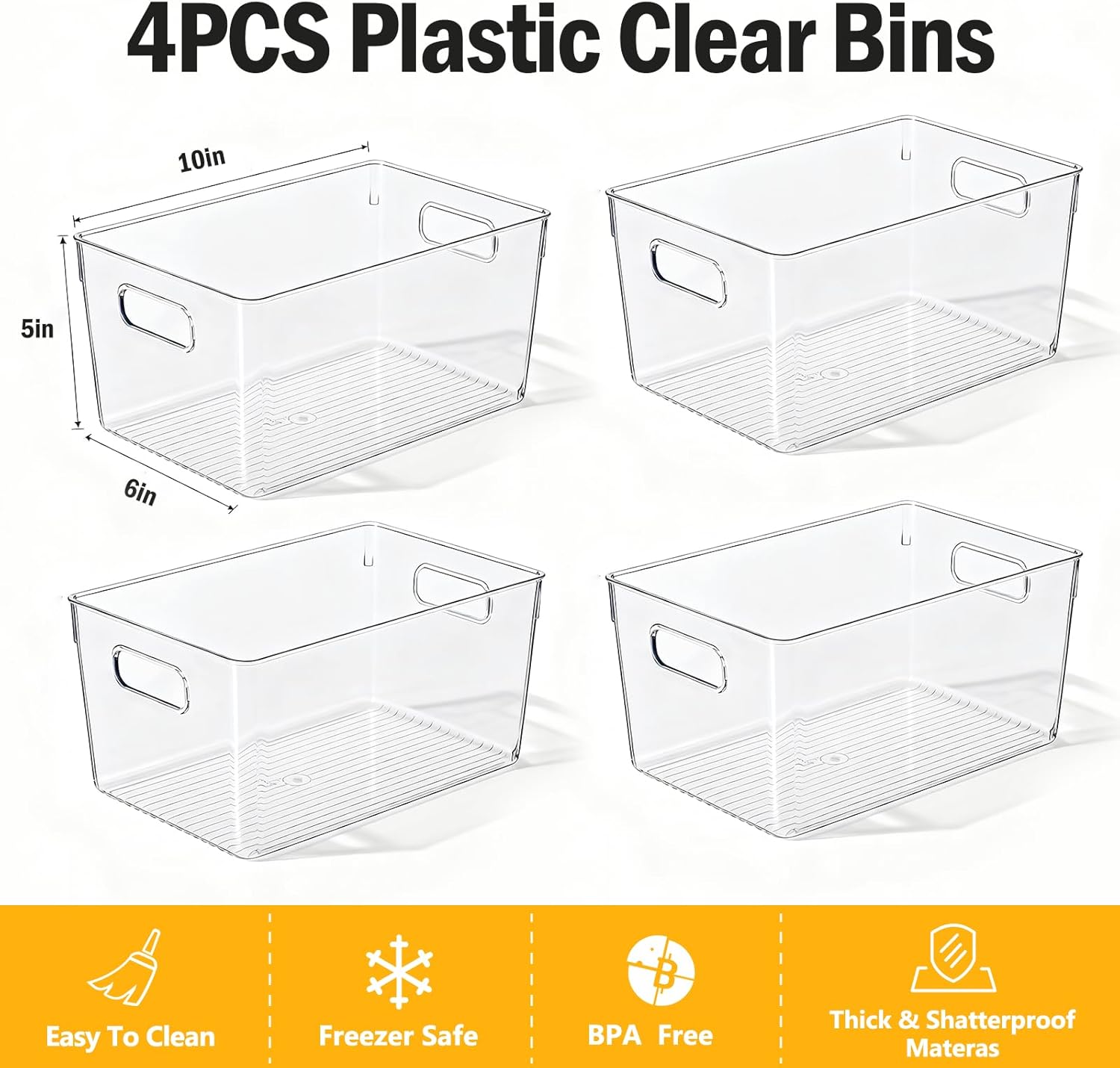 Clear Pantry Organizer Bins, Plastic Organizers & Storage Containers, Cabinet Organizer, Home Organization Must Haves for Kitchen, Laundry Room, Office, Closet & Freezer (4 Pack)