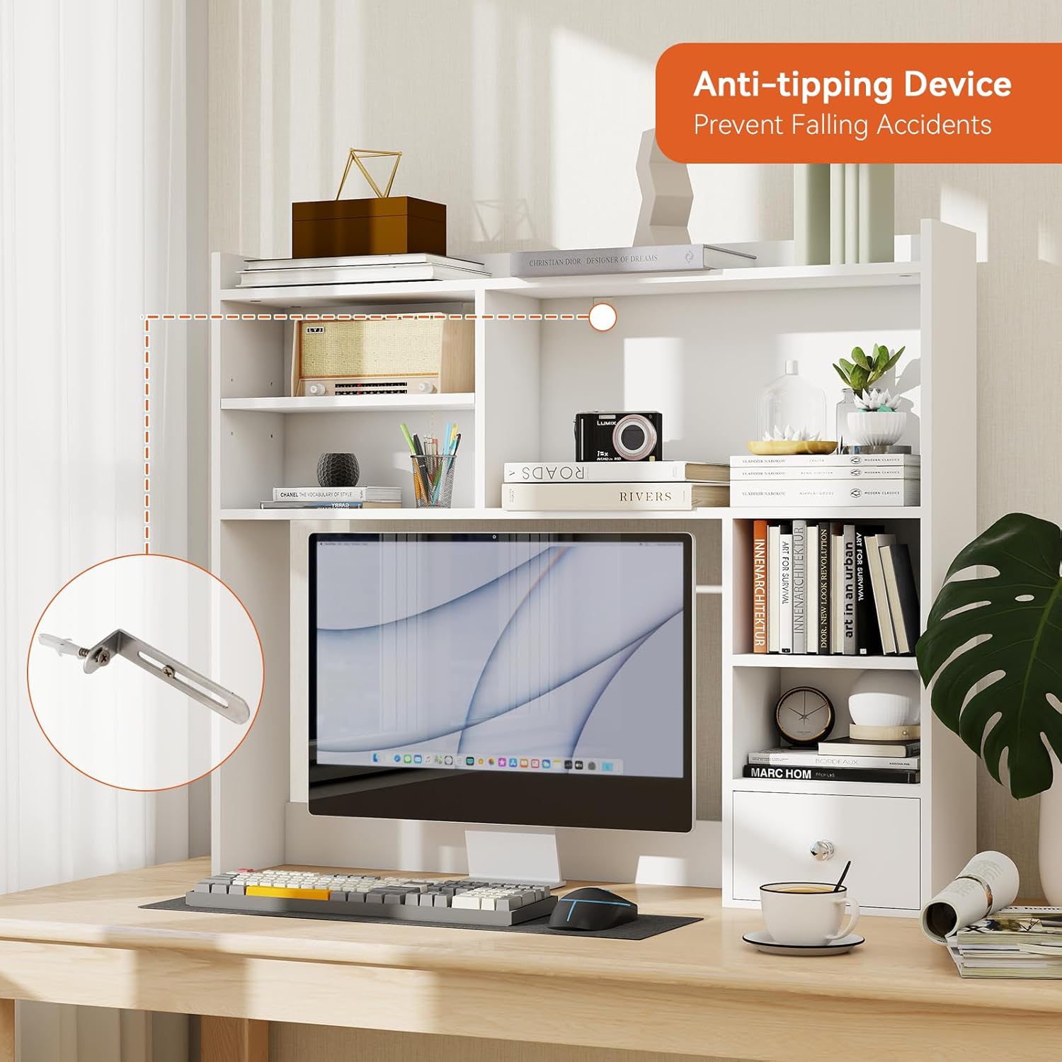 - Safe and Durable Design: The desk shelves are made of high quality engineer wood for long life. Since the bookshelf are 29” tall, they are equipped with 2 anti-tip furniture wall anchors hidden behind them to prevent falling accidents. In addition, the top fall protection flap also prevents items from falling