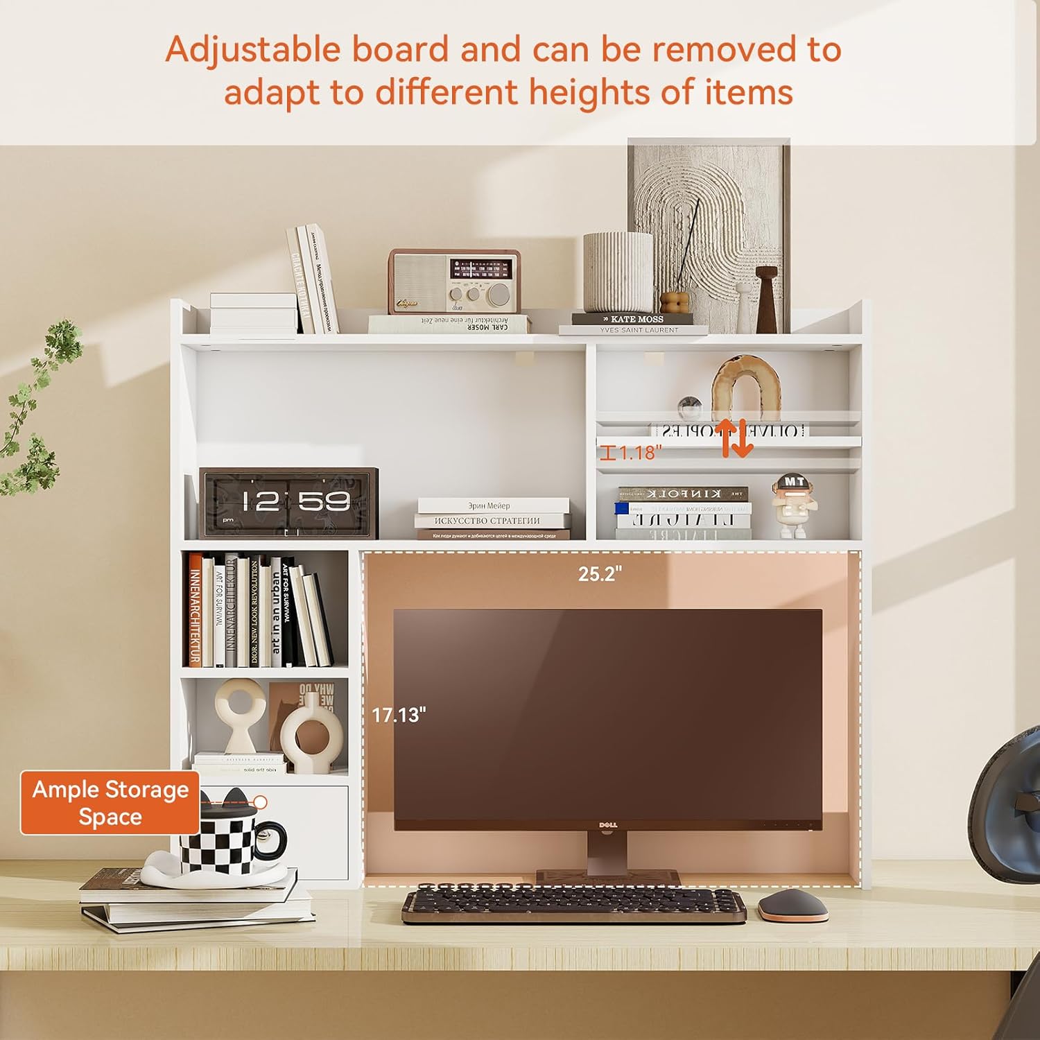 - Bookshelf Organizer with Adjustable Compartments: This home office desk bookshelf shelf also offers adjustable and removable compartments on the upper part, which makes it easy to store items of different sizes and personalize pegboard according to your usage habits