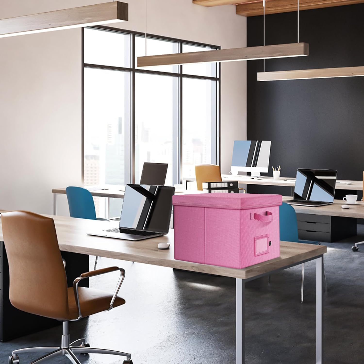 File Organizer Boxes with Lid, Linen Hanging File Storage Boxes with Handle, Collapsible Document Filling Boxes for Letter/Legal Folder, Portable File Box for Office/Decor/Home (2 Pack, Pink)
