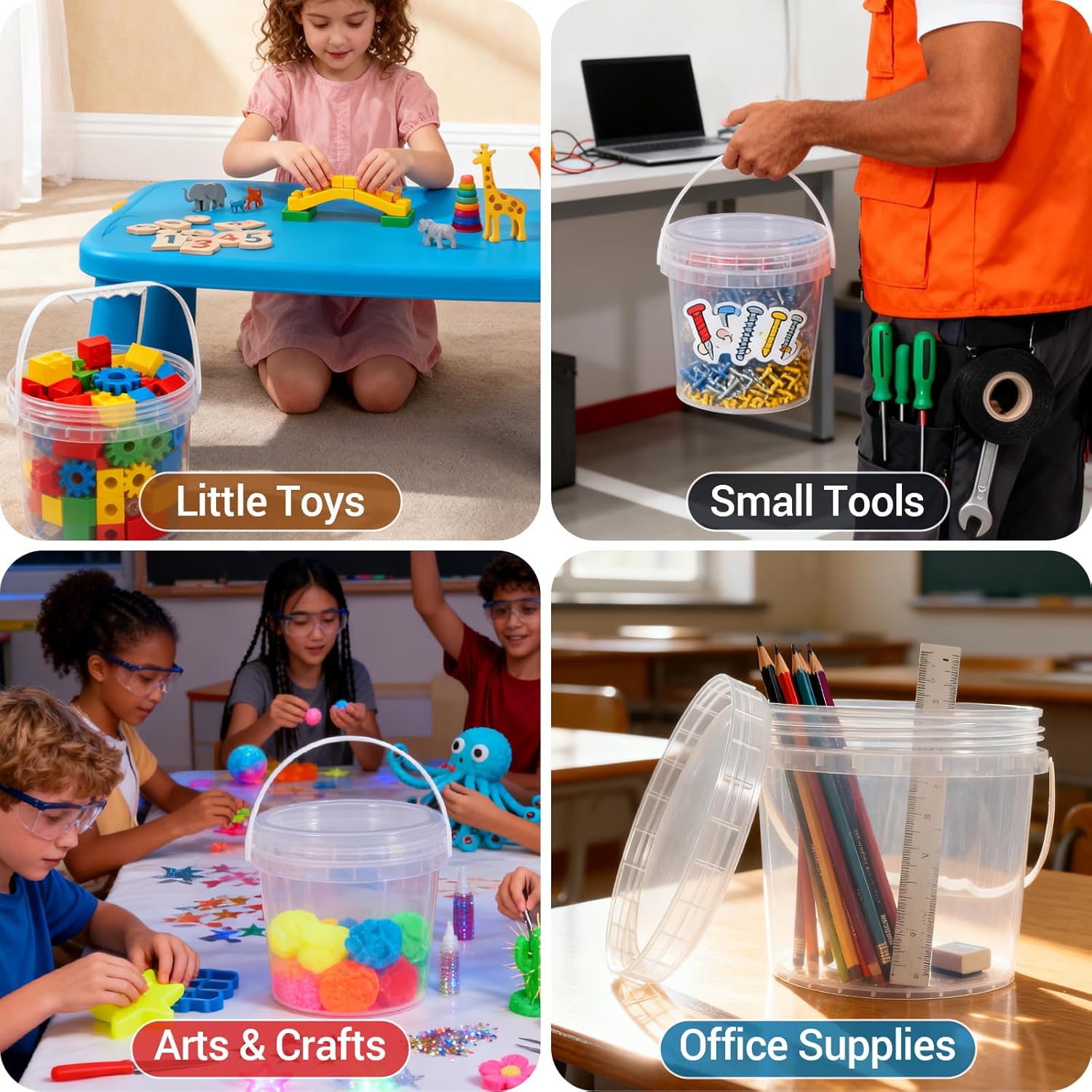- Multi-Scene Bucket Use This clear 1gallon plastic bucket and bucket with lid (compact bucket) has a transparent design—see candy or cleaning supplies inside. It’s made as plastic containers with lids for food/food storage essentials, but also works as a mini cleaning bucket, halloween bucket, or craft container. Unlike flimsy quart containers with lids or one-time fruit cups with lid, it’s durable and keeps contents visible.