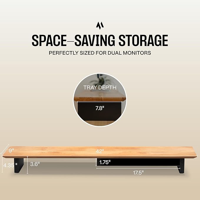 - DESIGNED FOR DUAL MONITORS: At 42 x 9 x 4.3 in, it fits two screens comfortably while creating extra space below. Store your keyboard, notebook, and more. The wool-felt metal tray keeps smaller essentials within reach.