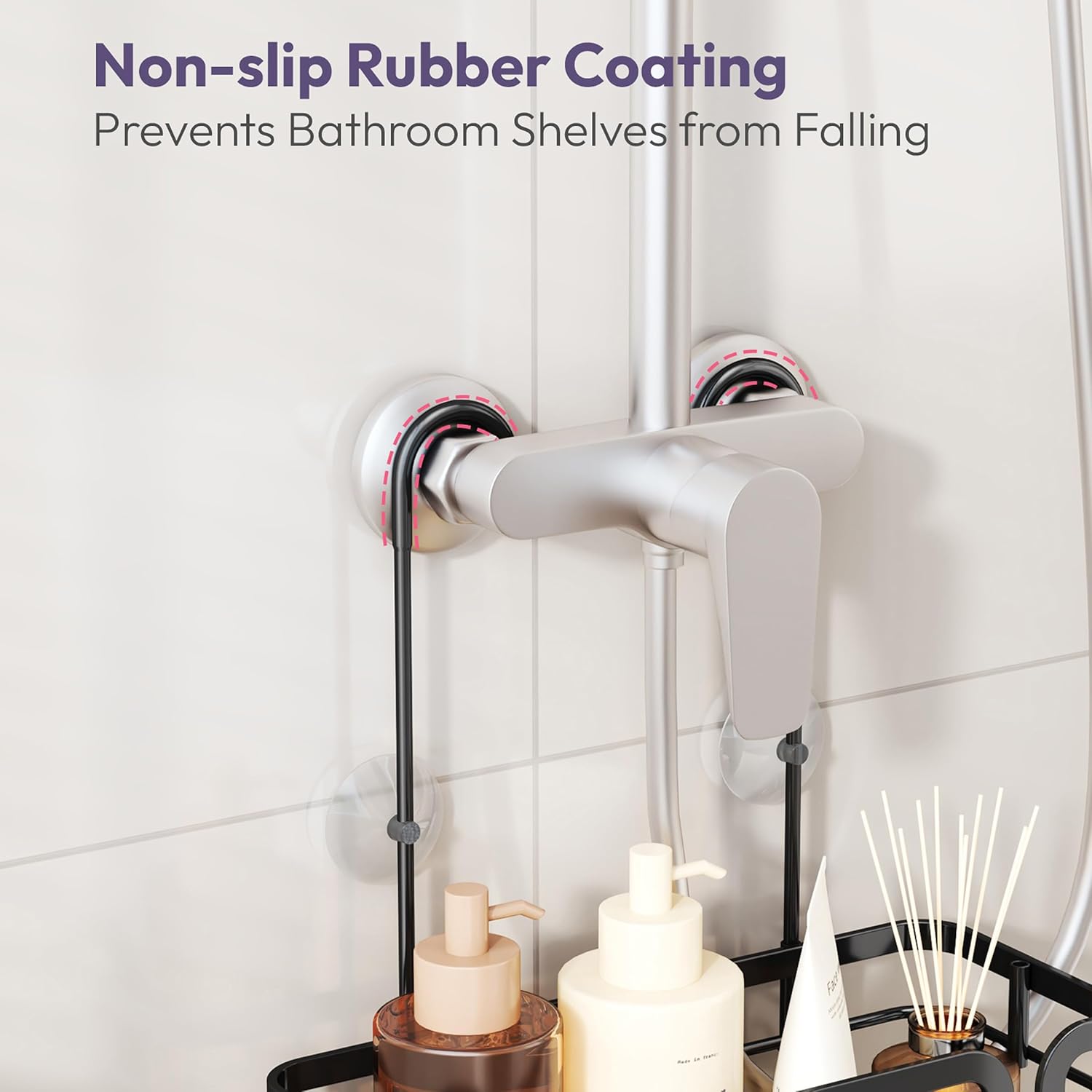 - [Heavy-Duty Support] Shower hanging organizer comes with anti-slip rubber pads and strong suction cups to hold the rack securely in place — prevents wobbling or slipping, even when fully loaded