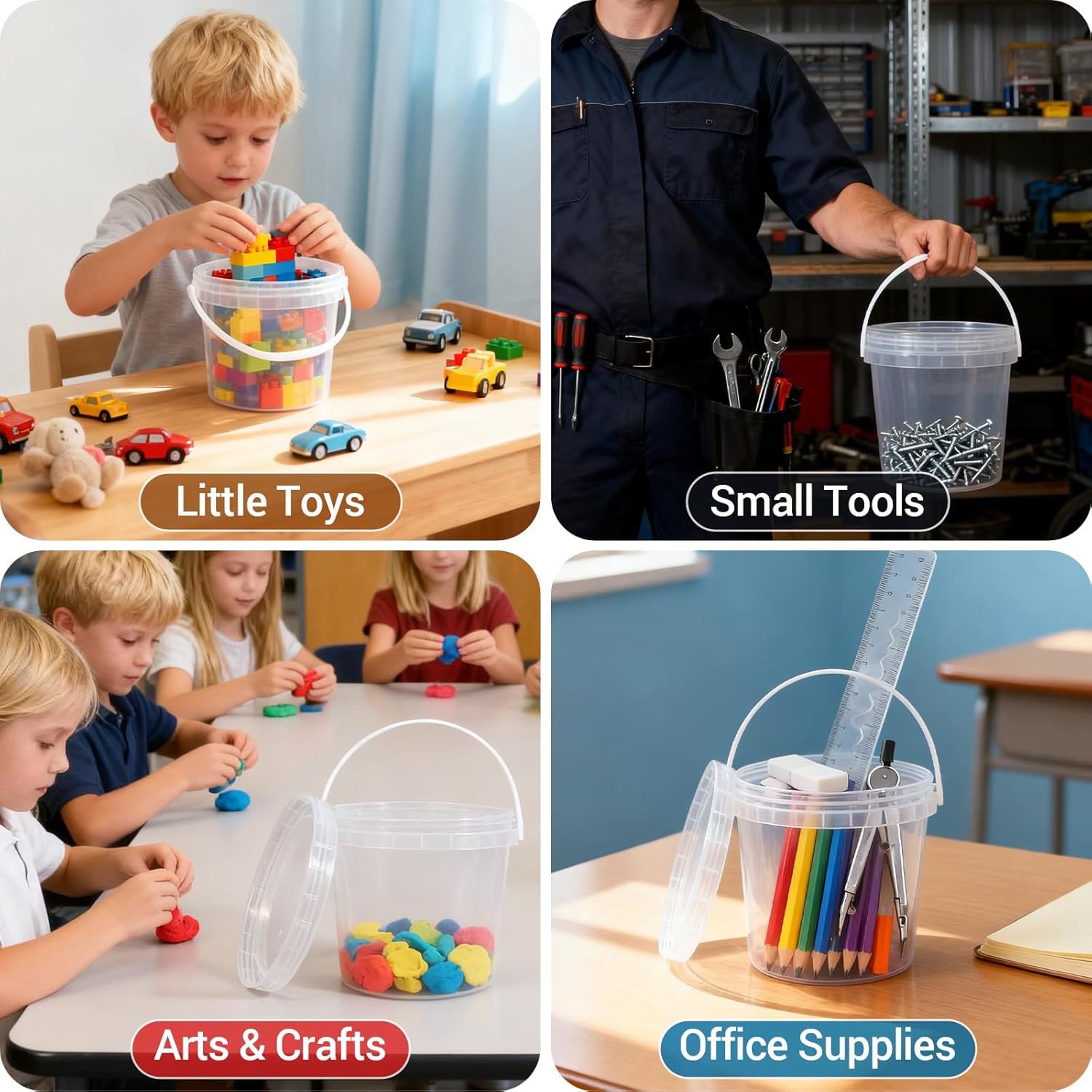 - Multi-Scene Bucket Use This clear 64oz plastic bucket and bucket with lid (compact bucket) has a transparent design—see candy or cleaning supplies inside. It’s made as plastic containers with lids for food/food storage essentials, but also works as a mini cleaning bucket, halloween bucket, or craft container. Unlike flimsy quart containers with lids or one-time fruit cups with lid, it’s durable and keeps contents visible.