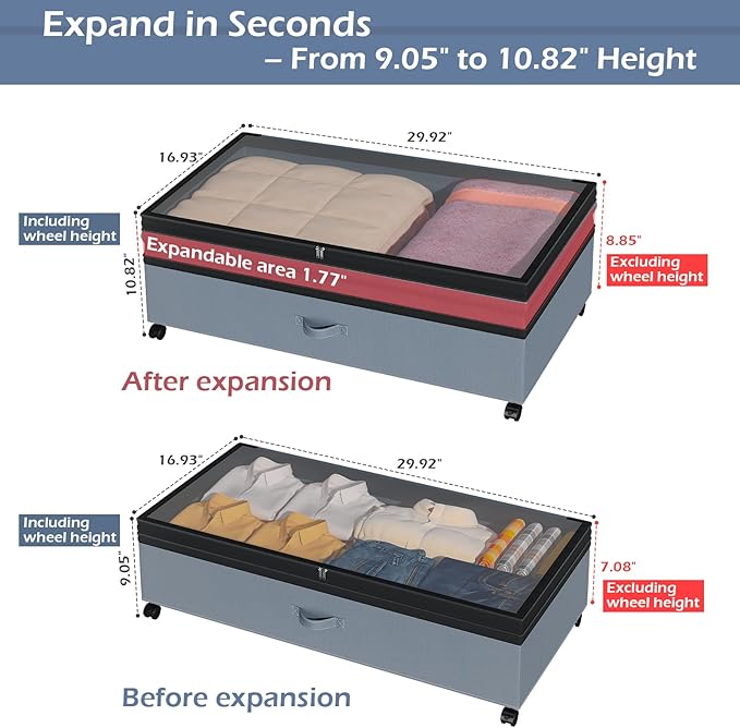 - š Expandable Height in Seconds: Unlike standard underbed bins, height expands from 9.05" to 10.82" (with wheels), fixing the problem of under-bed clearance reduction caused by different mattress thicknessesāfits more bed types without size mismatch.