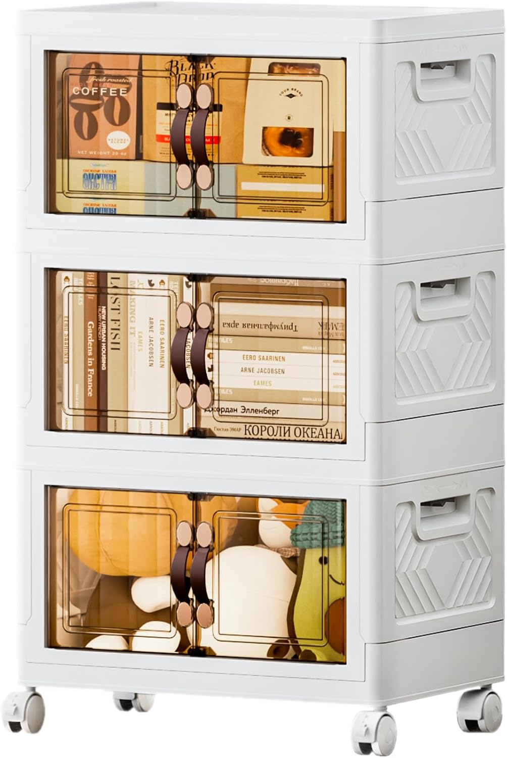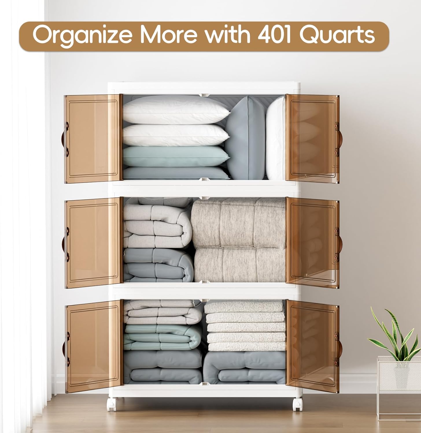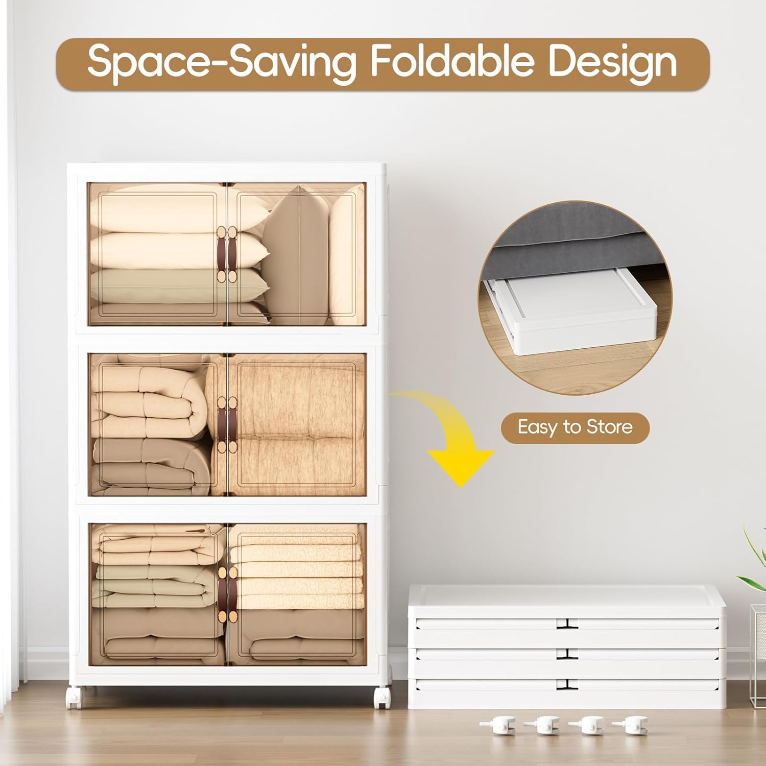 JEKO&JEKO 400Qt Stackable Storage Bins with Lids and Wheels, Foldable Collapsible Plastic Boxes for Clothes, Home, White, 3 Pack