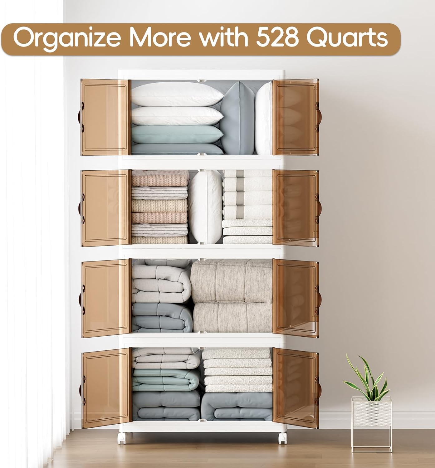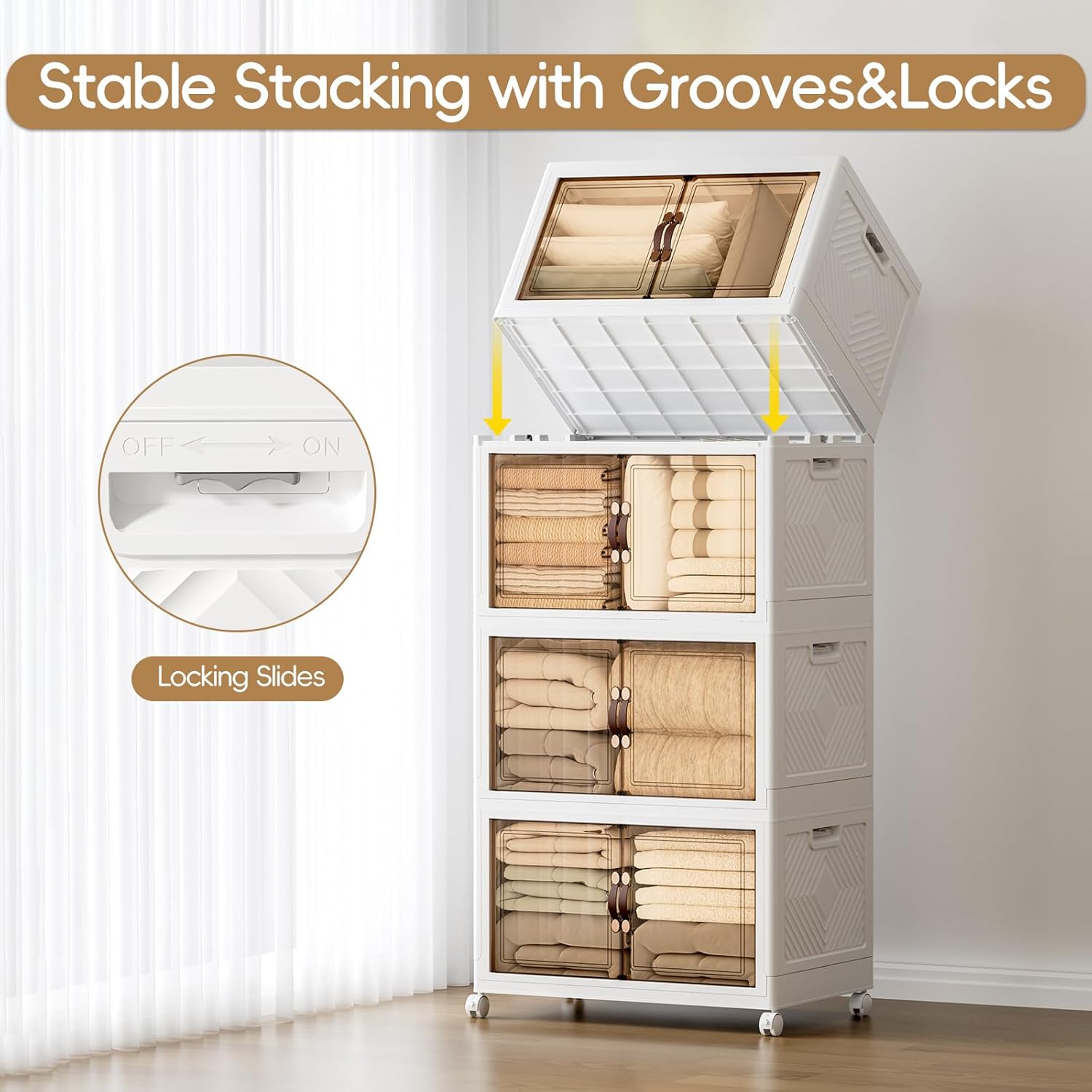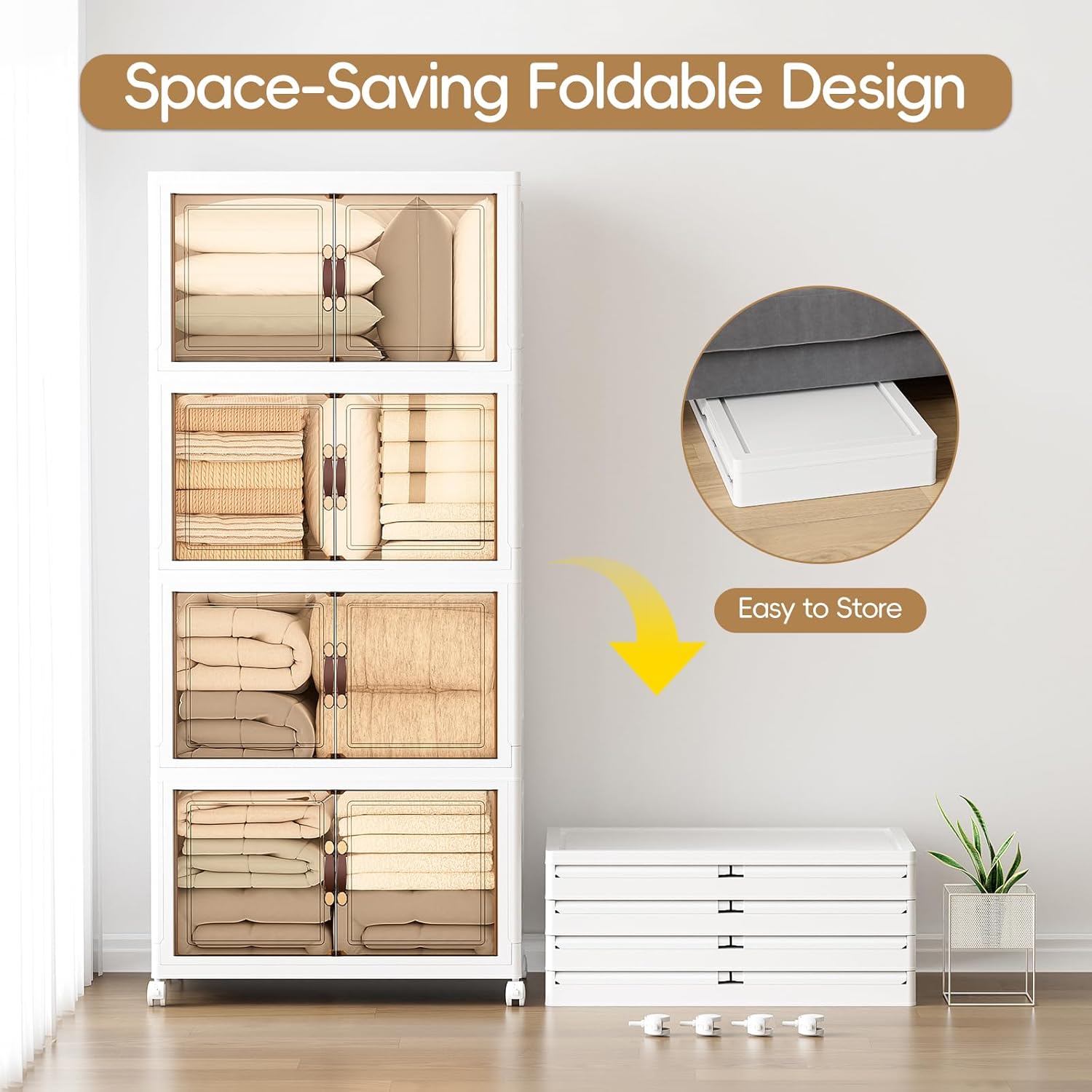 JEKO&JEKO 528Qt Stackable Storage Bins with Lids and Wheels, Foldable Collapsible Plastic Boxes for Clothes, Home, White, 4 Pack